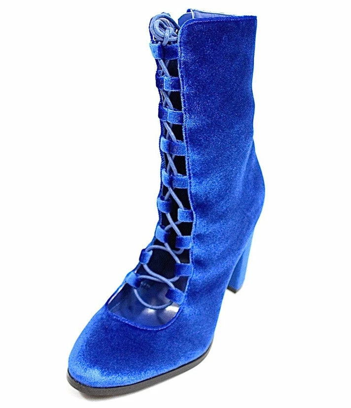 - A velvet upper as well as a front lace up closure with gold anglets.Â