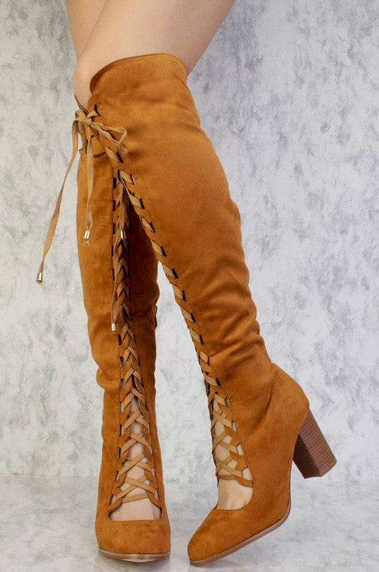 - A faux suede upper with scalloped straps and an adjustable lace up front.Â