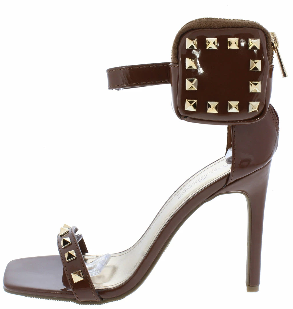 - A studded toe strap and a side studded ankle pouch.