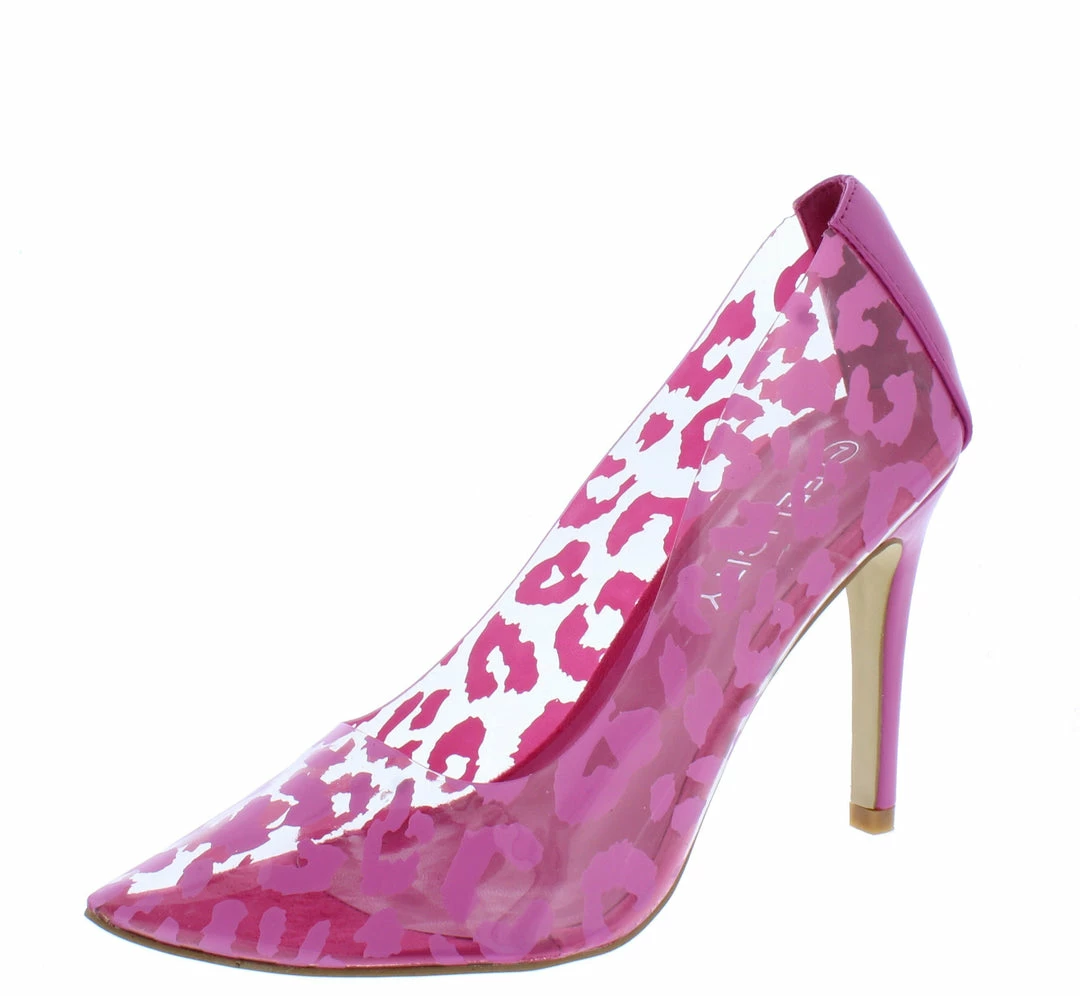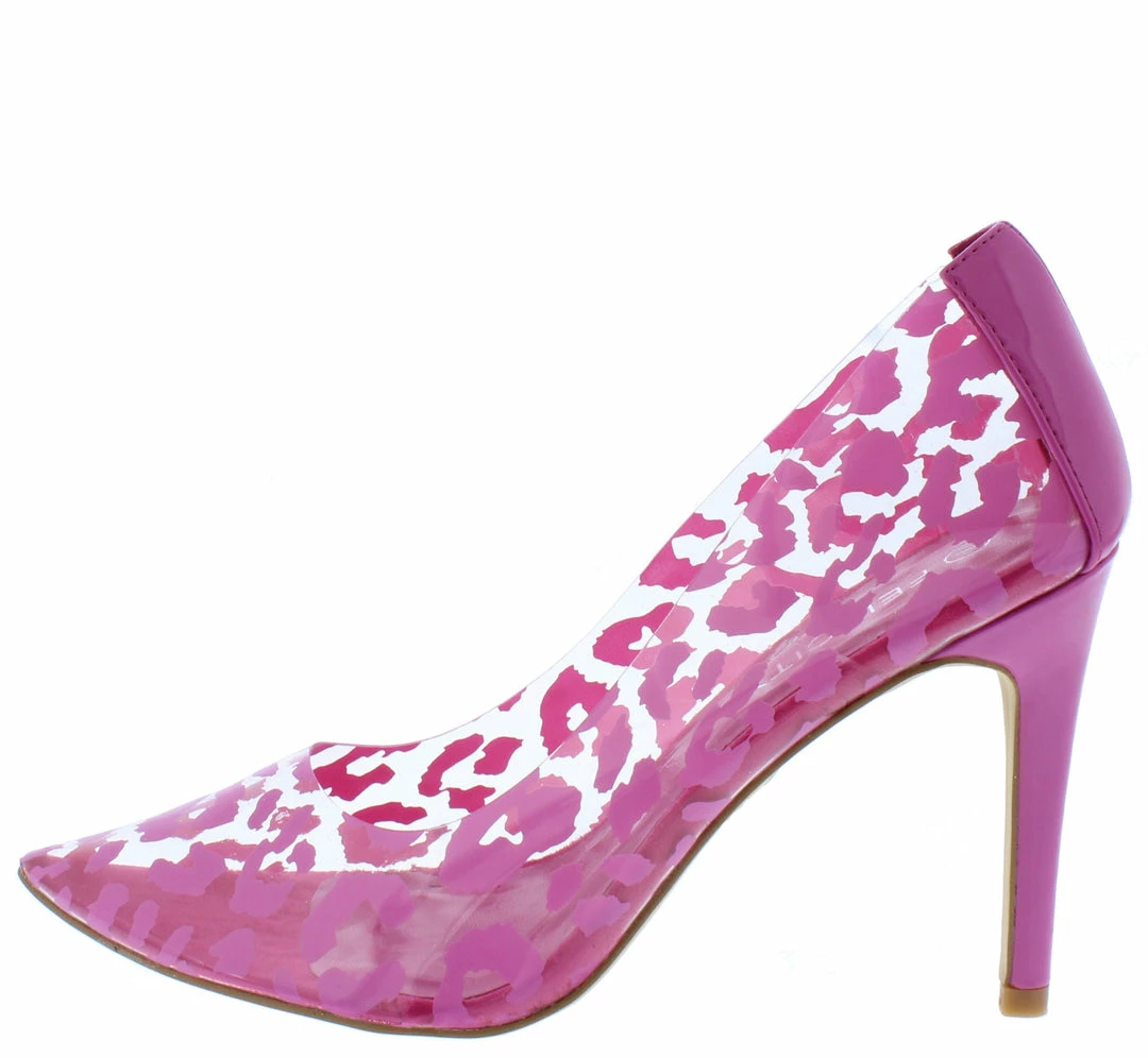 - A leopard print clear lucite upper.