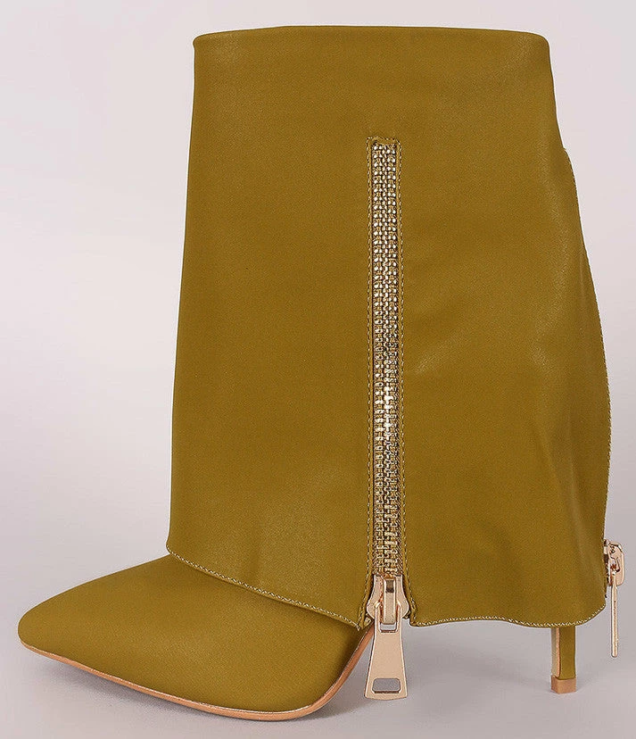 - A folded over flap with dual gold zipper detailing. Â