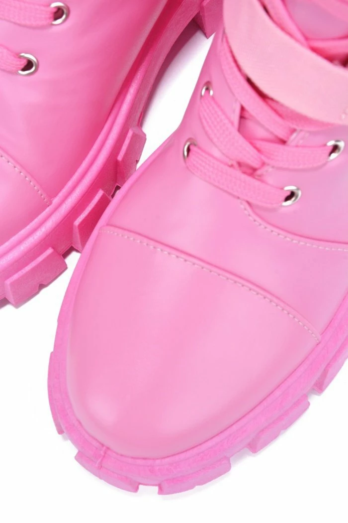 - A lace up front with a buckle strap detail.