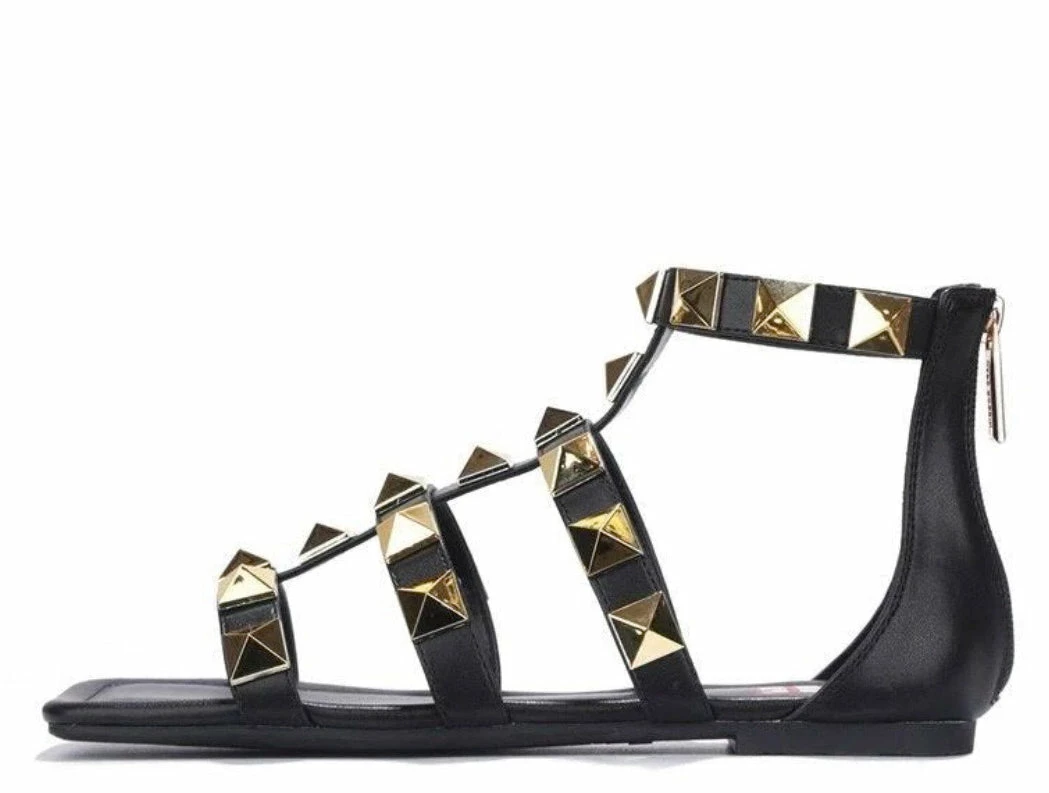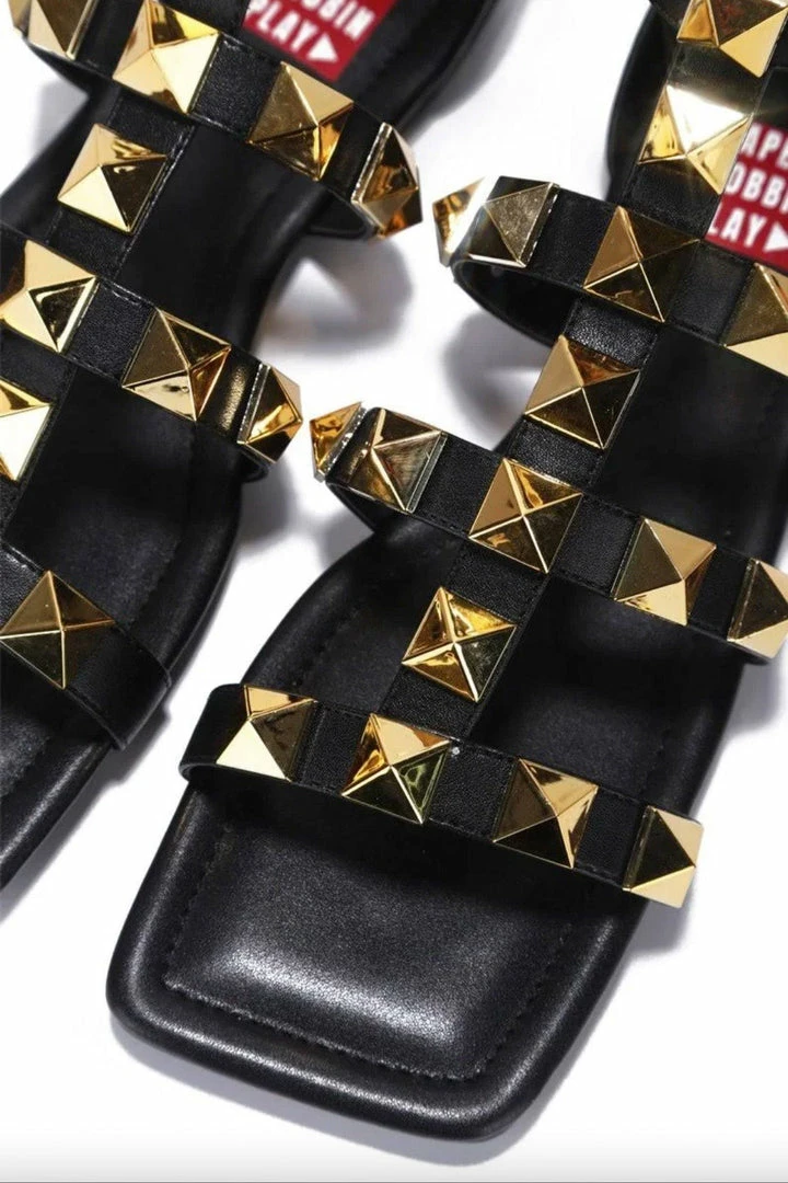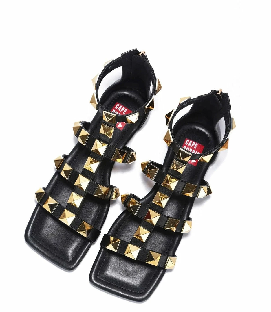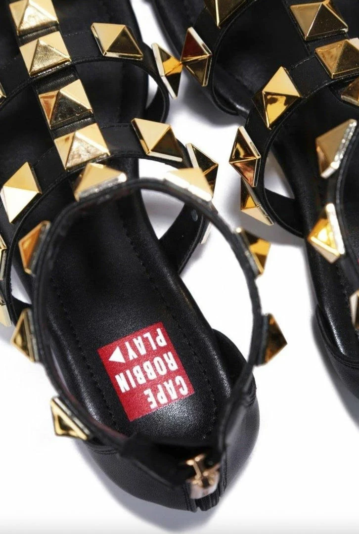 - A caged upper with rock stud details and a rear zipper closure.