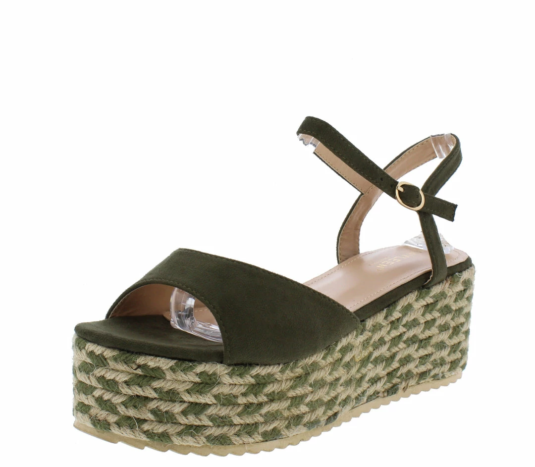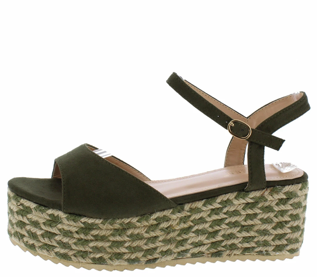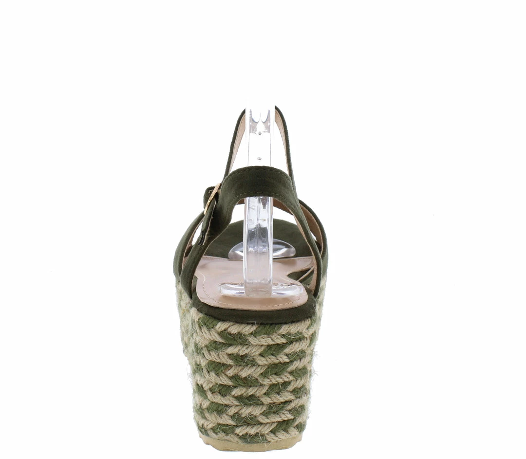 - An espadrille platform sole and wedge heel.