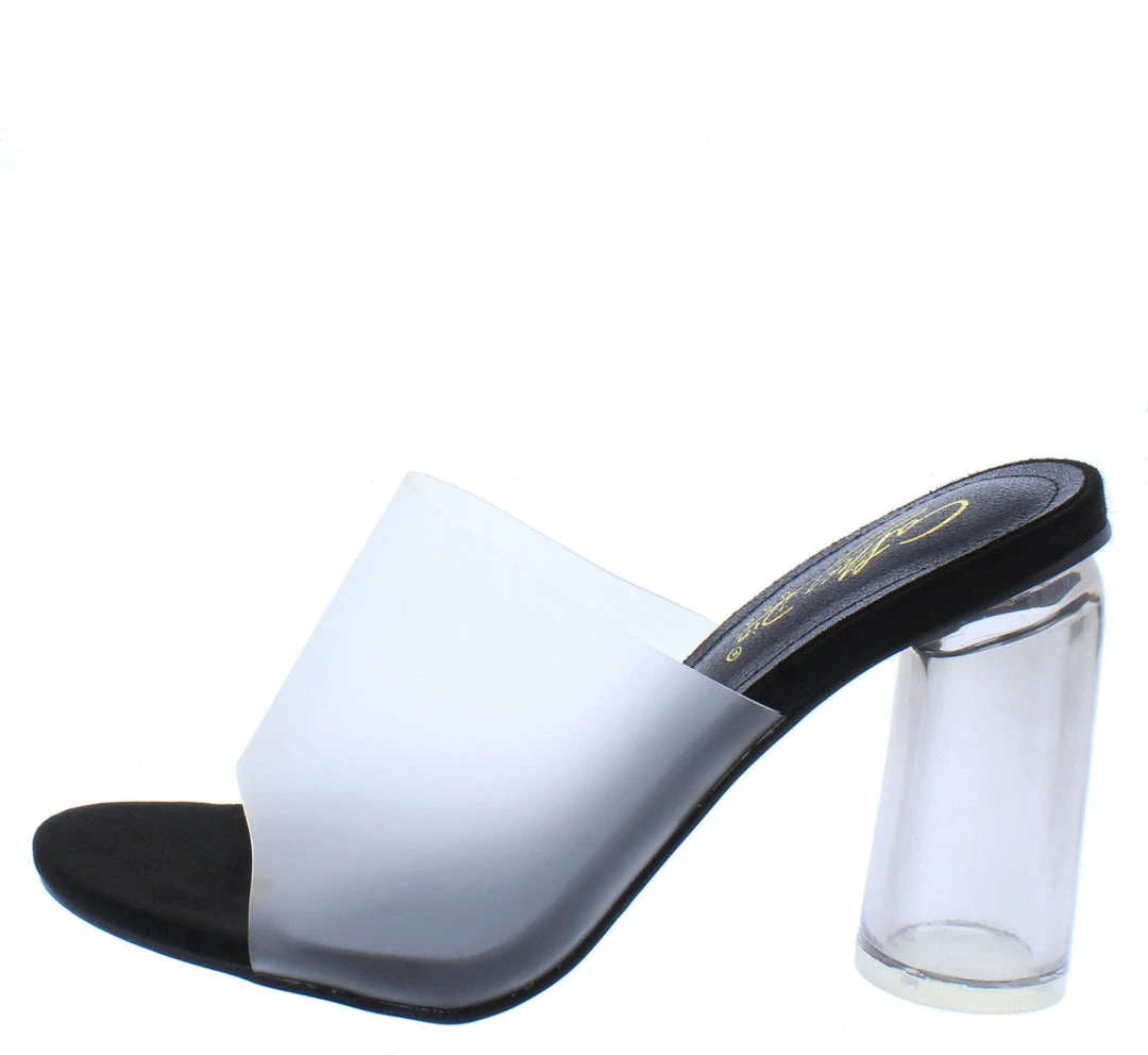 - Single sole styling and a lucite cylinder heel.