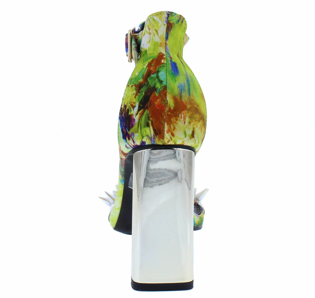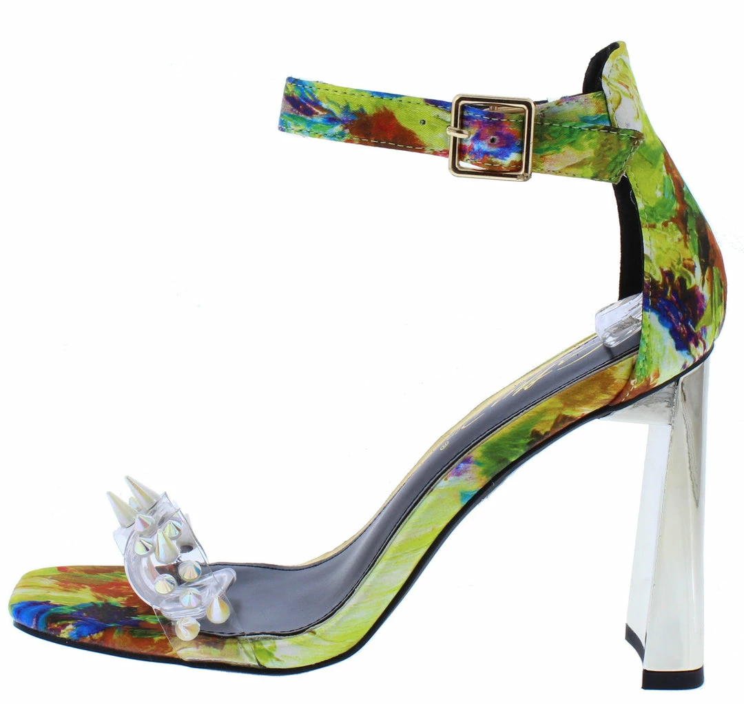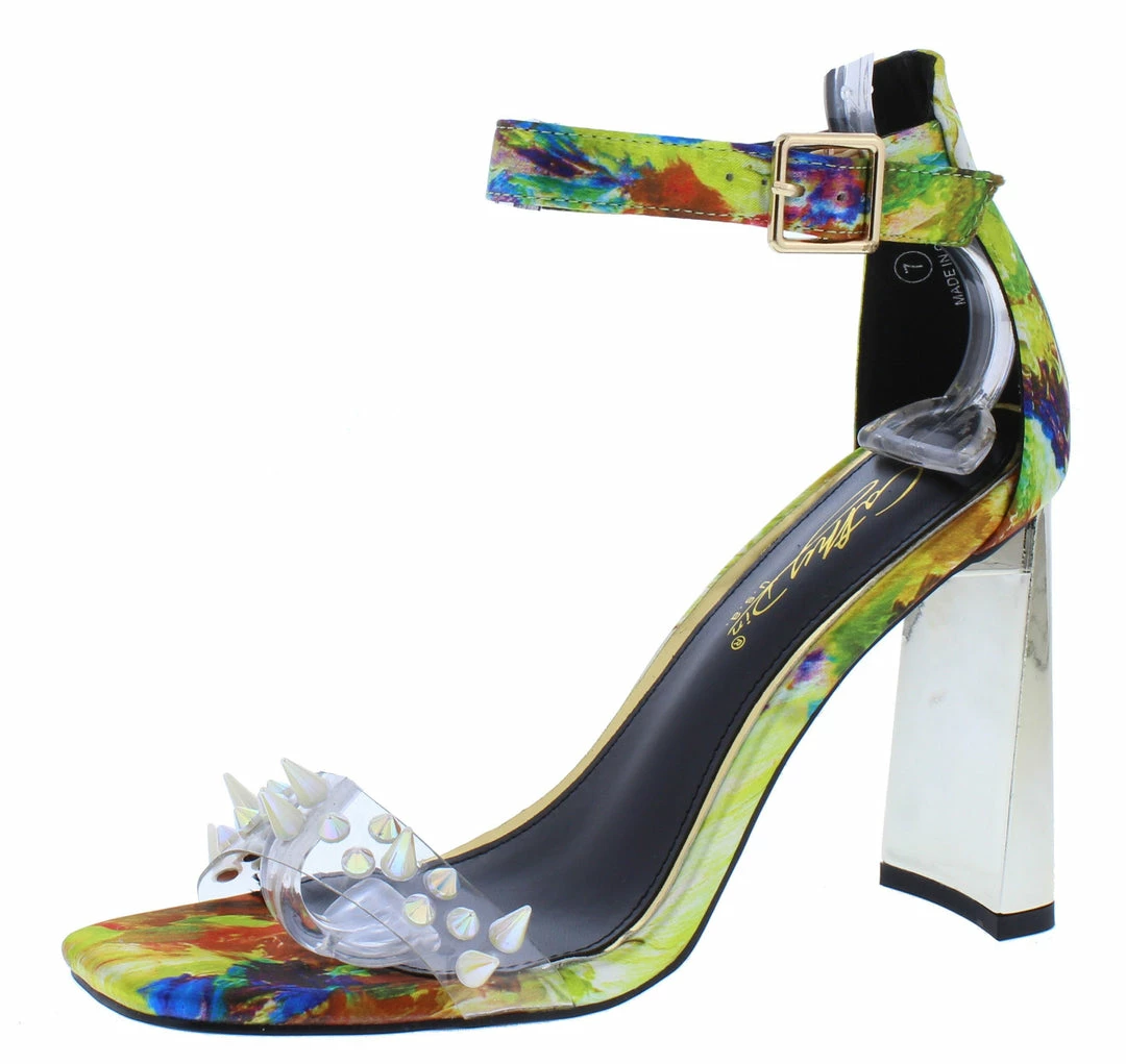 - A spike studded toe strap and an ankle strap with a side buckle closure.
