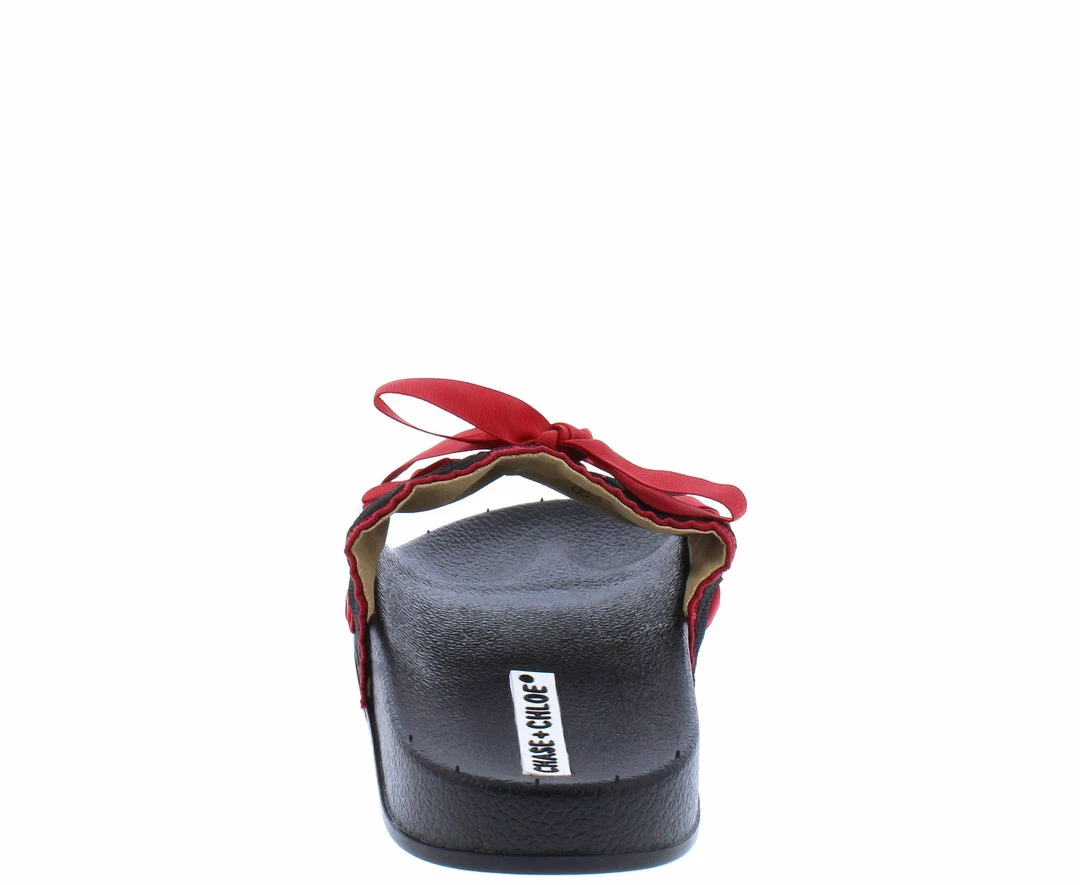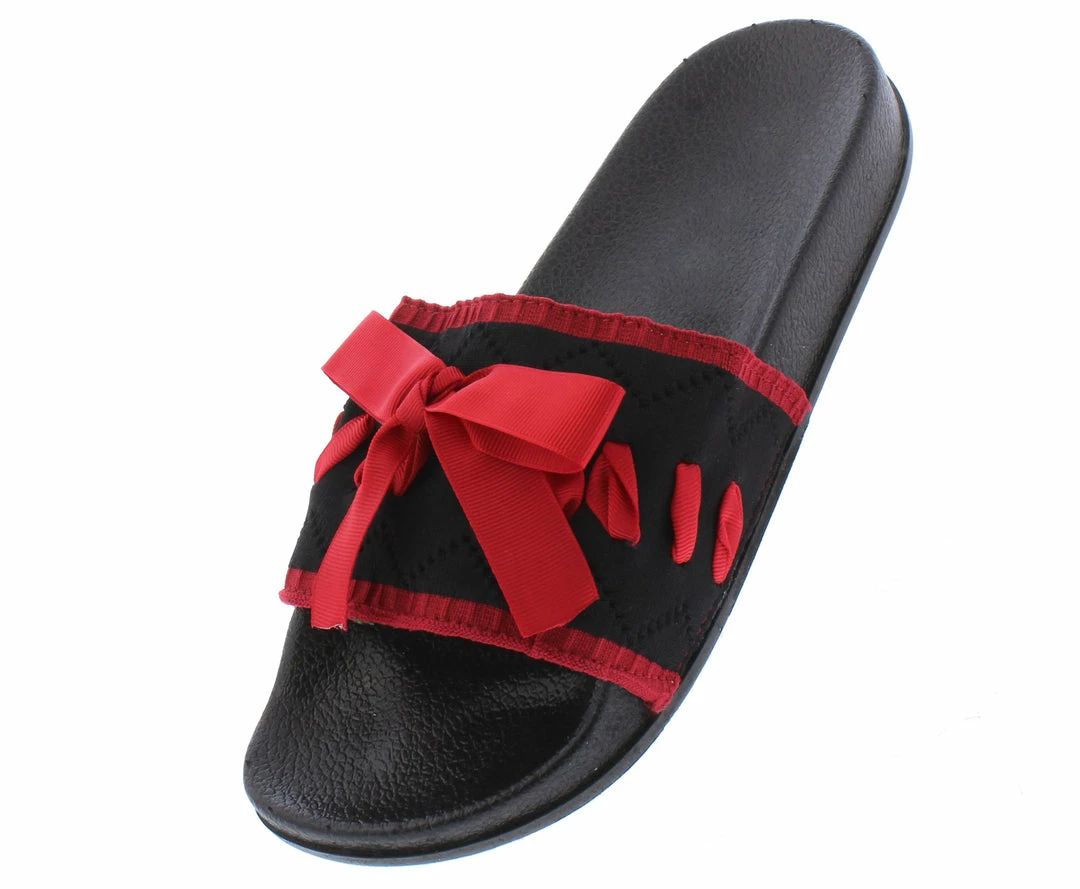 - A stitch tied upper with slide on construction.