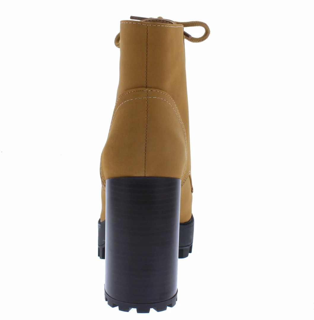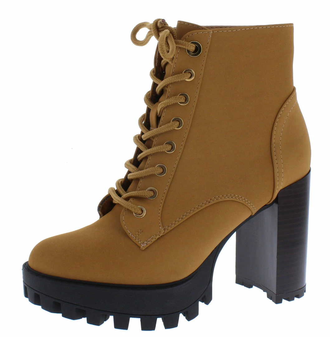 - A chunky lug sole and tall block heel.