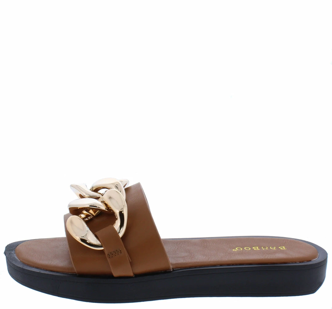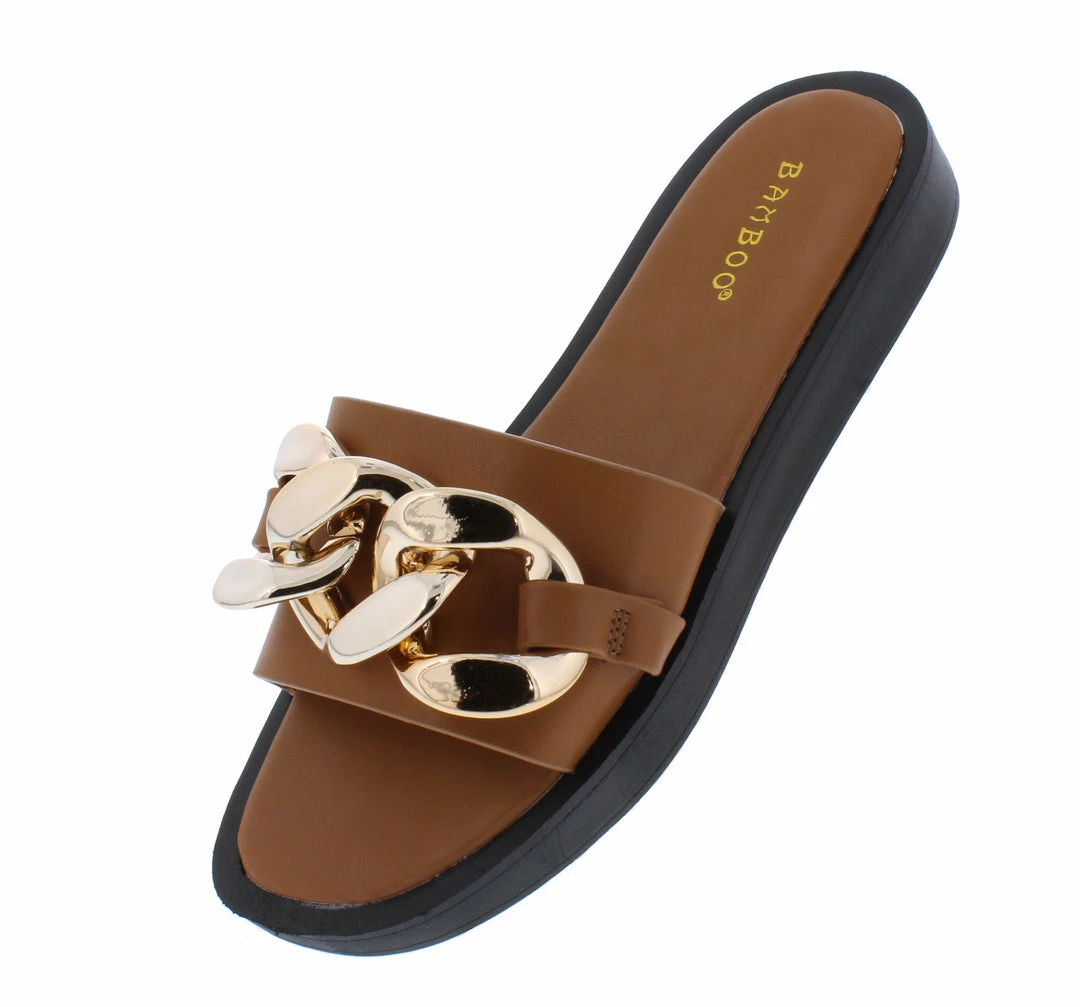 - A gently tapered flat sole and slide on construction.