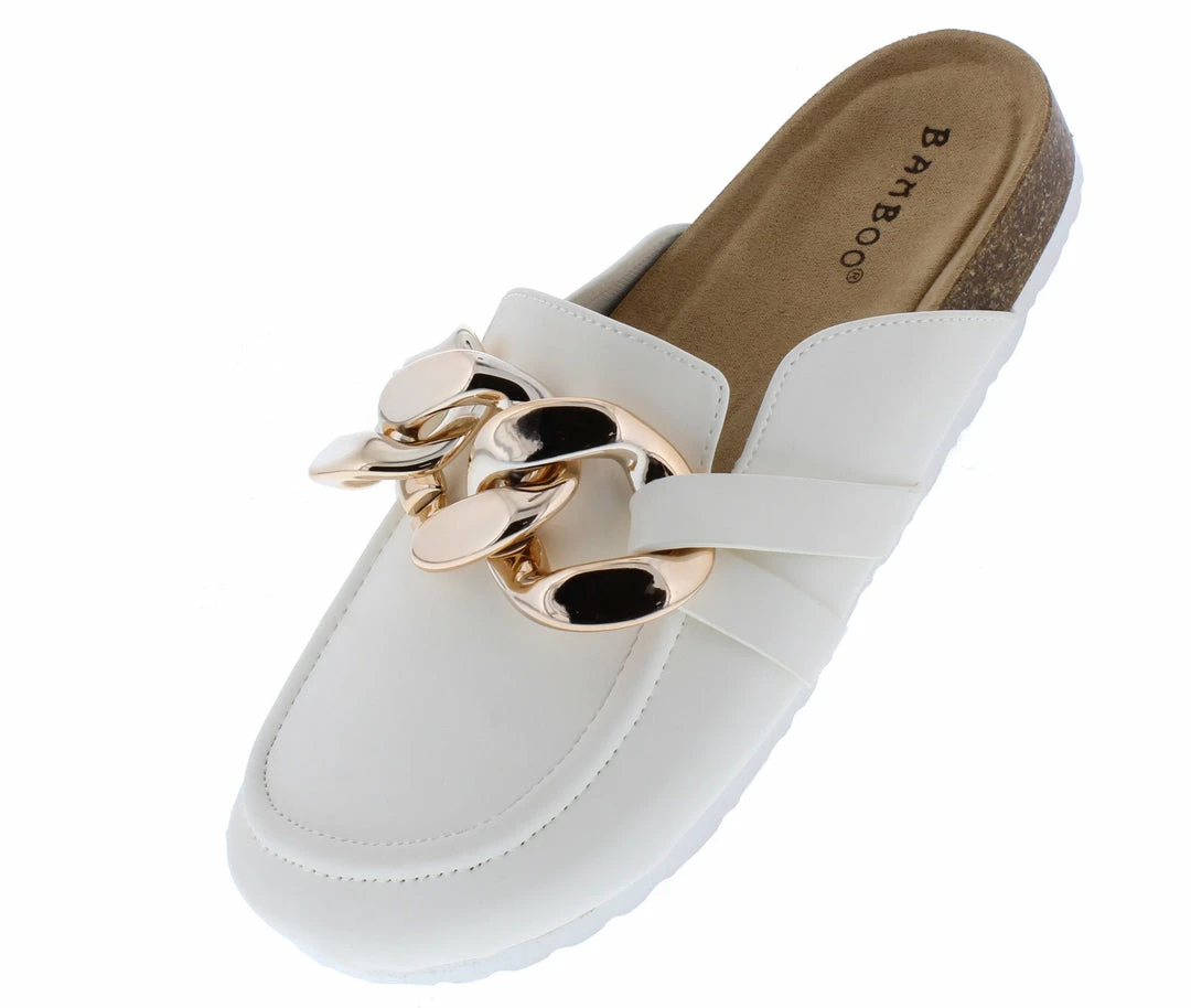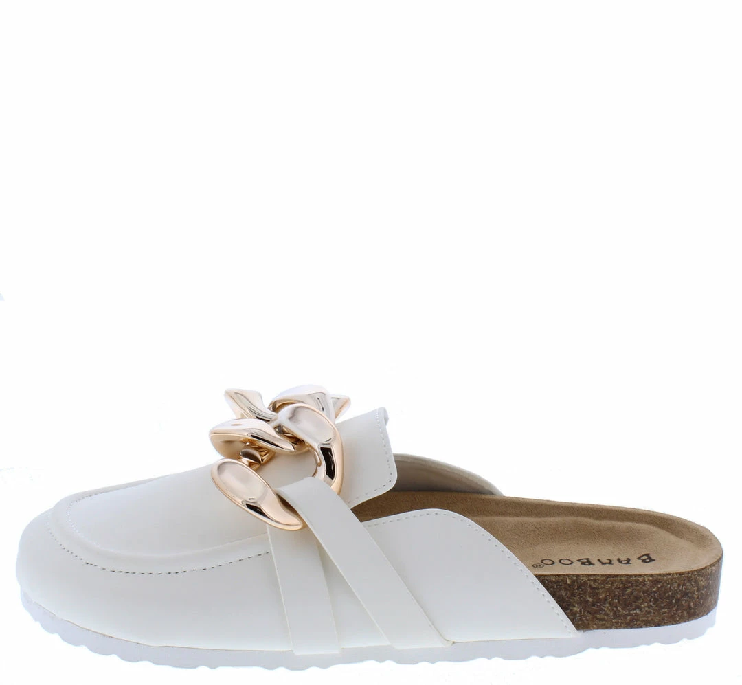 - Features a round toe paired with an open back.
