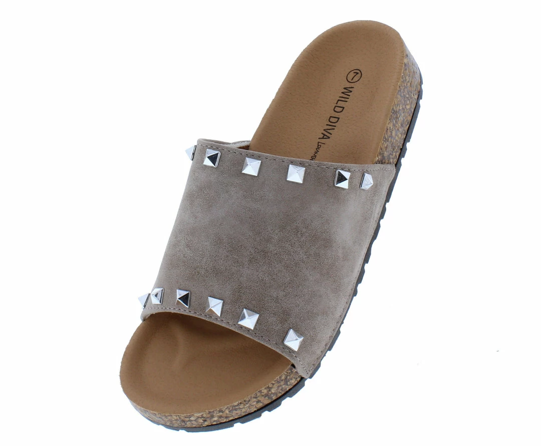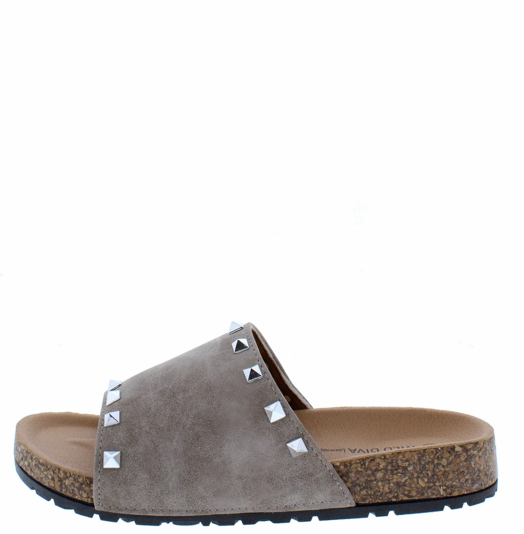 - A studded upper with slide on construction.