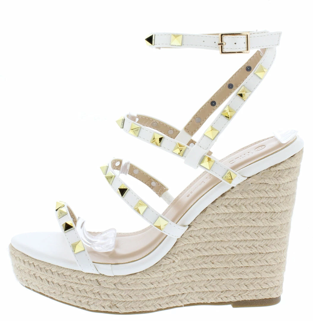 - A low platform espadrille sole and tall wedge heel.