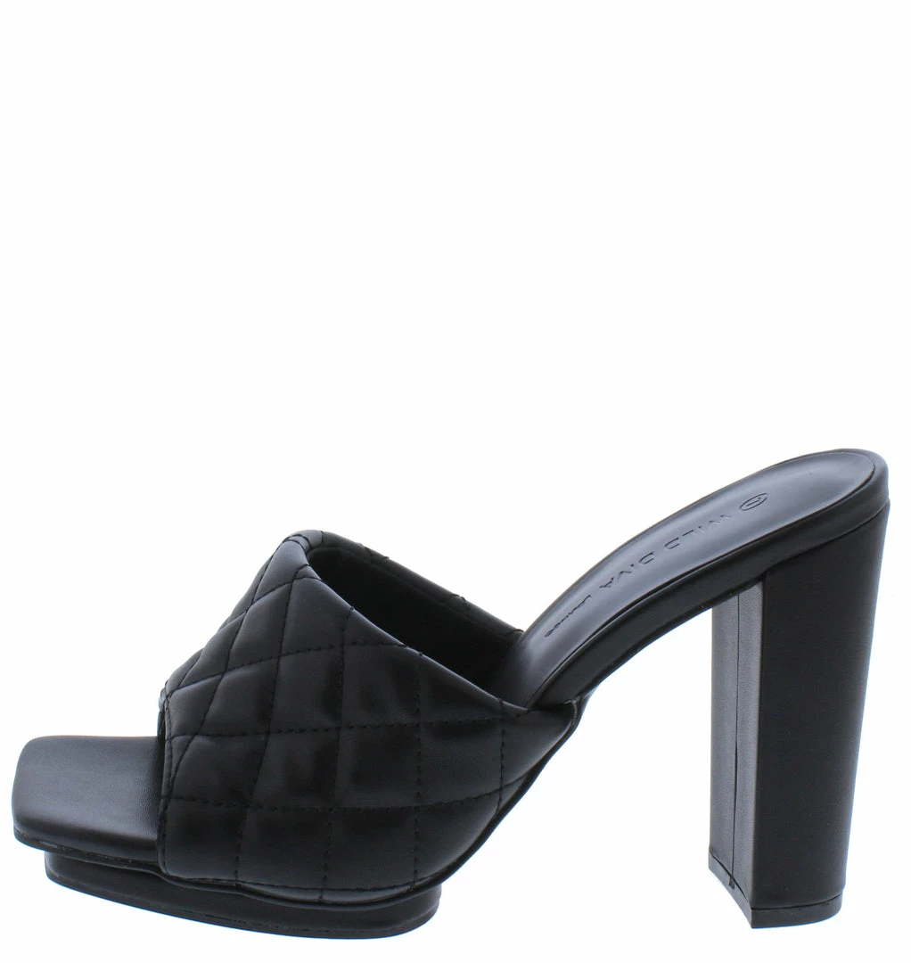 - A micro platform sole, and a tall tapered block heel.
