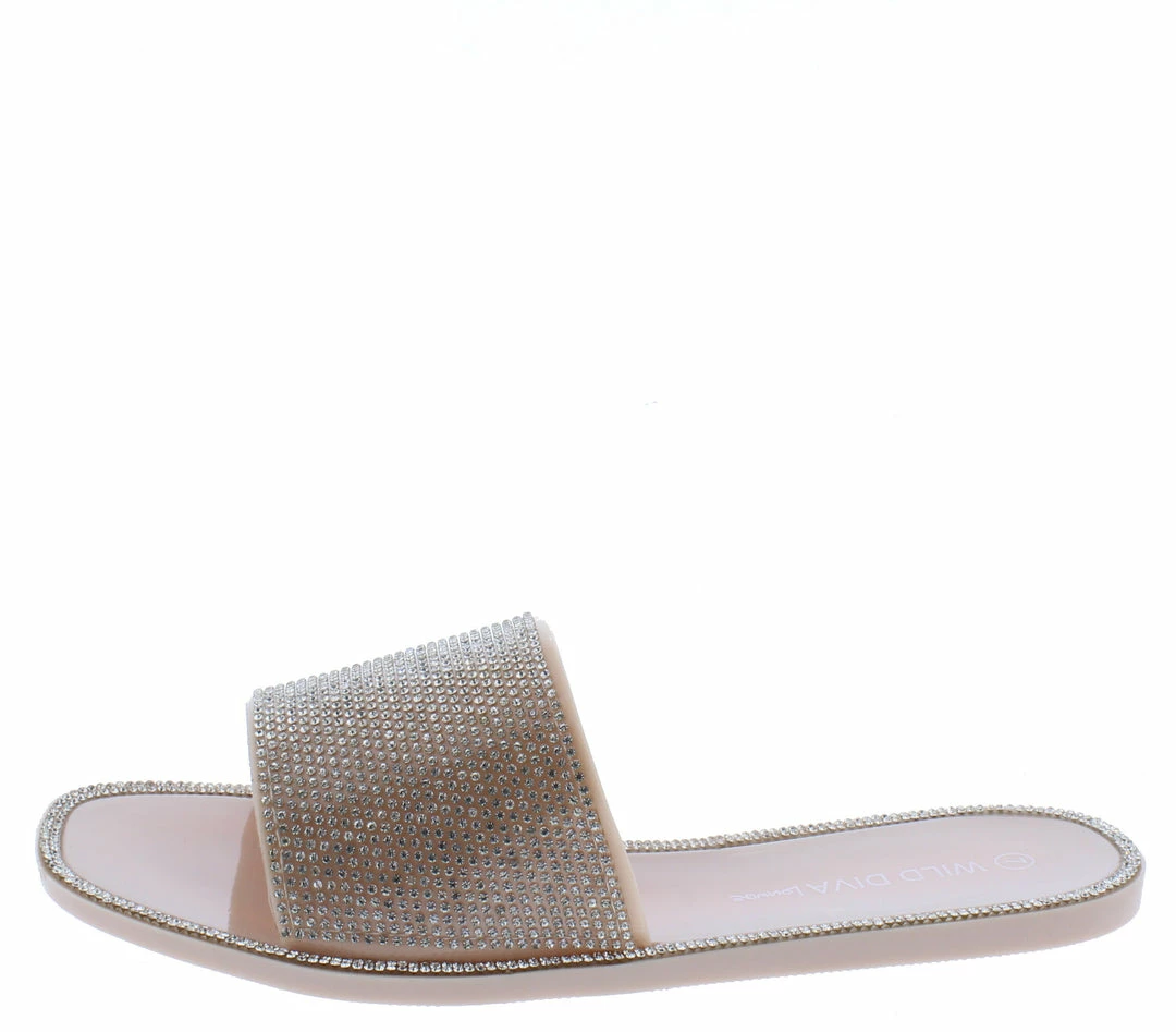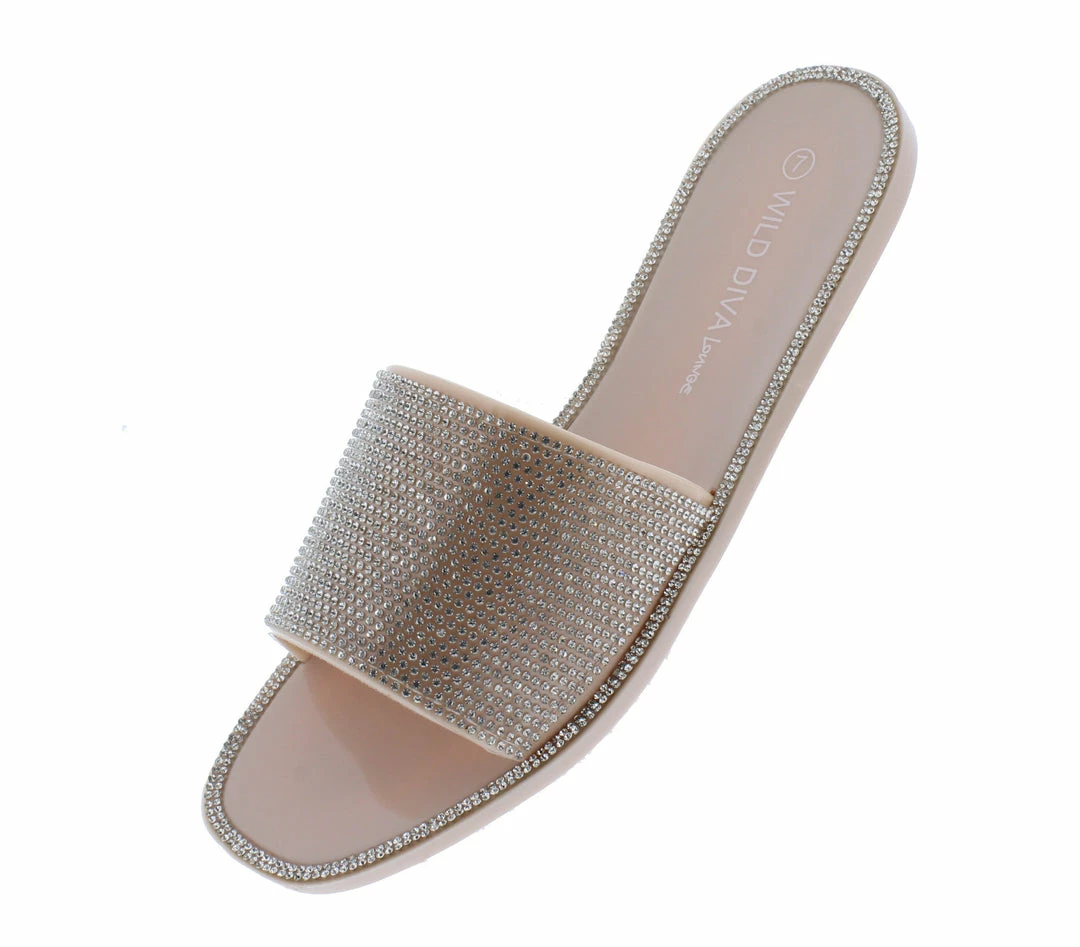 - A flat, single style sole with slide on construction.