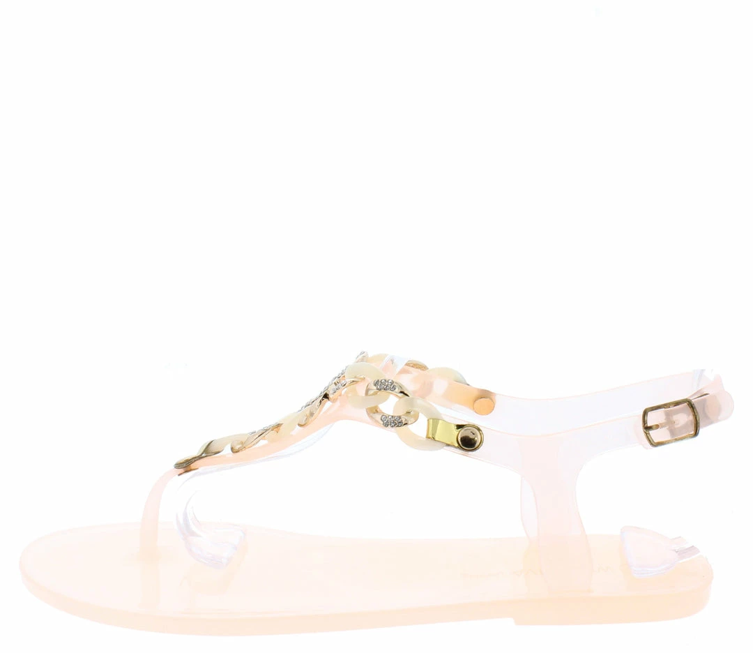 - An embellished y-chain detail and ankle strap closure.
