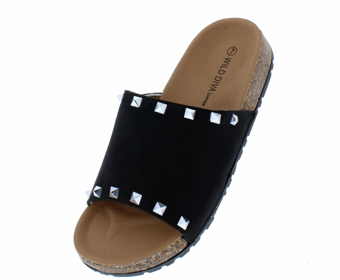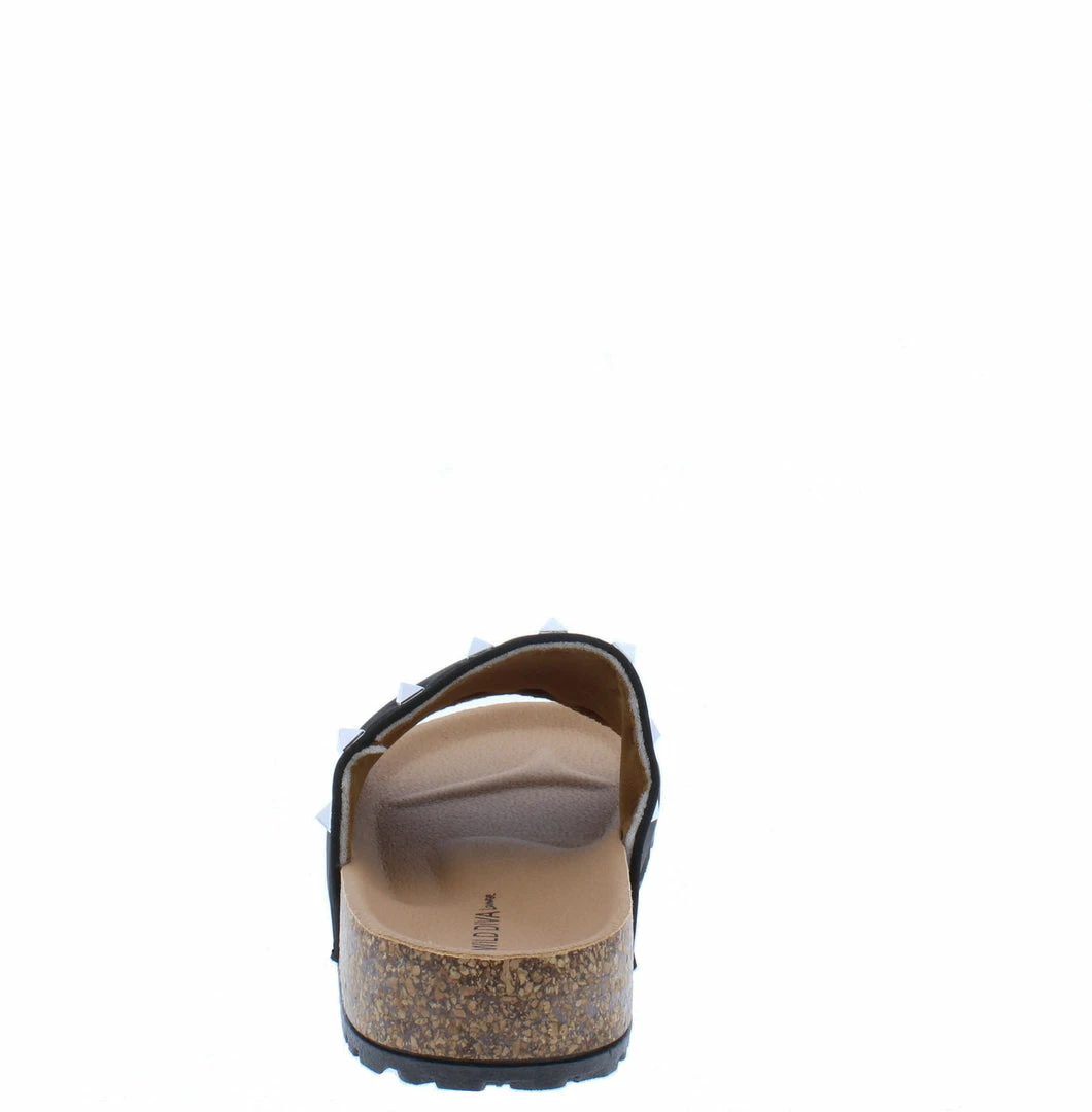 - A studded upper with slide on construction.