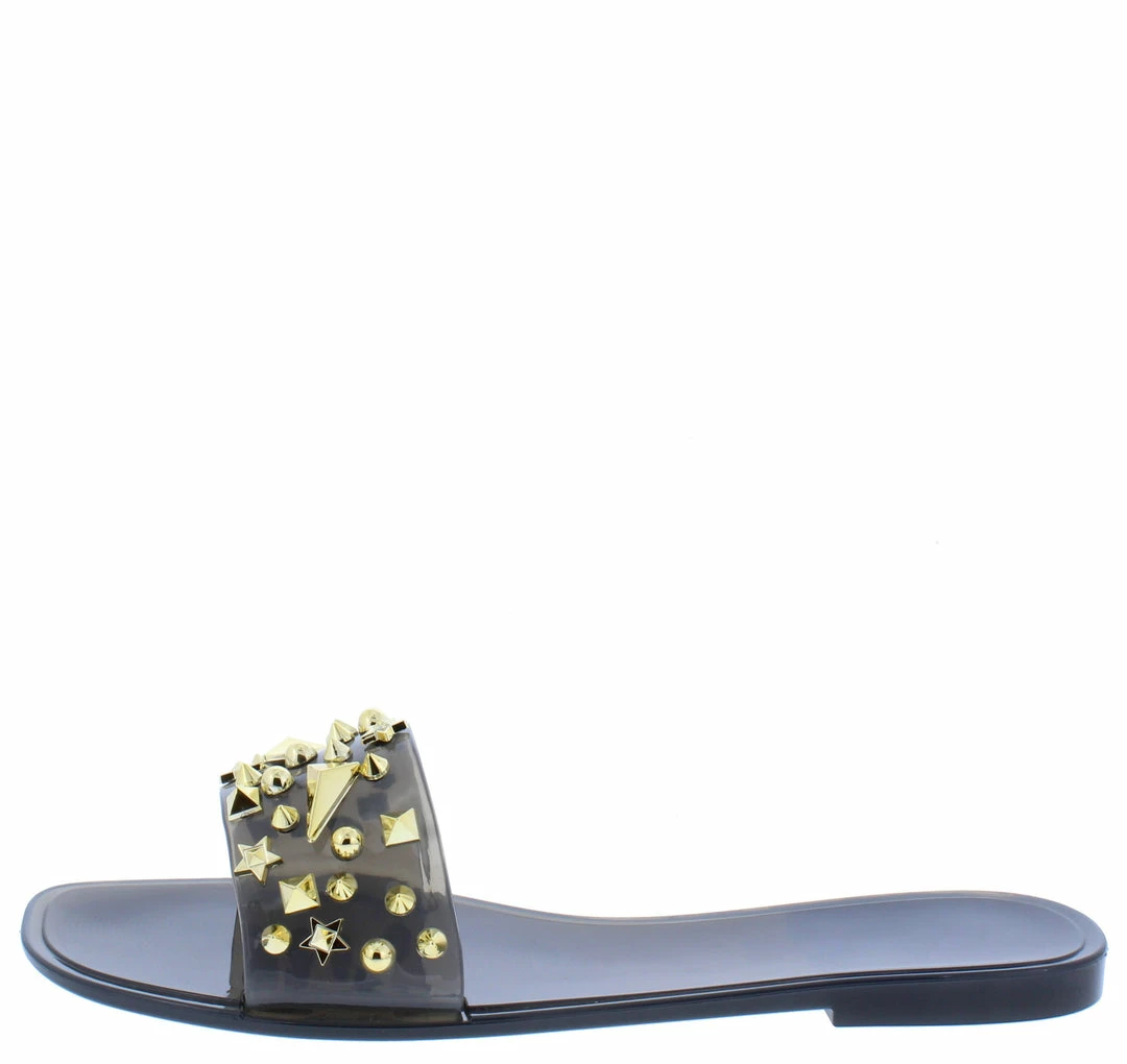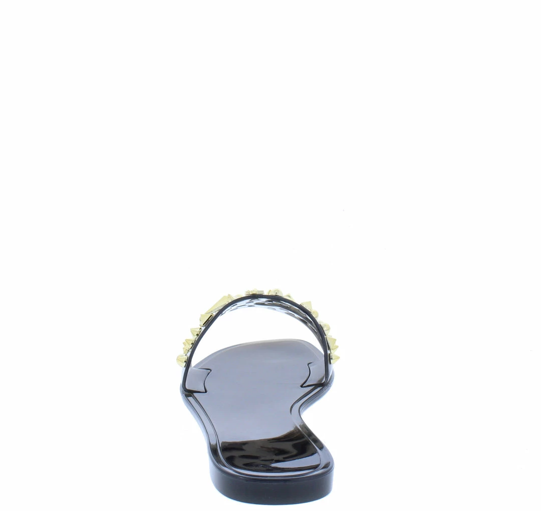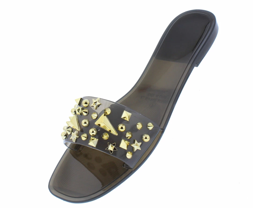 - A studded lucite upper with slide on construction.