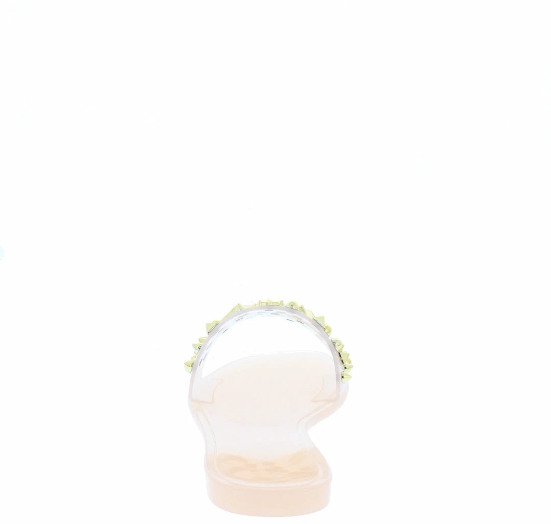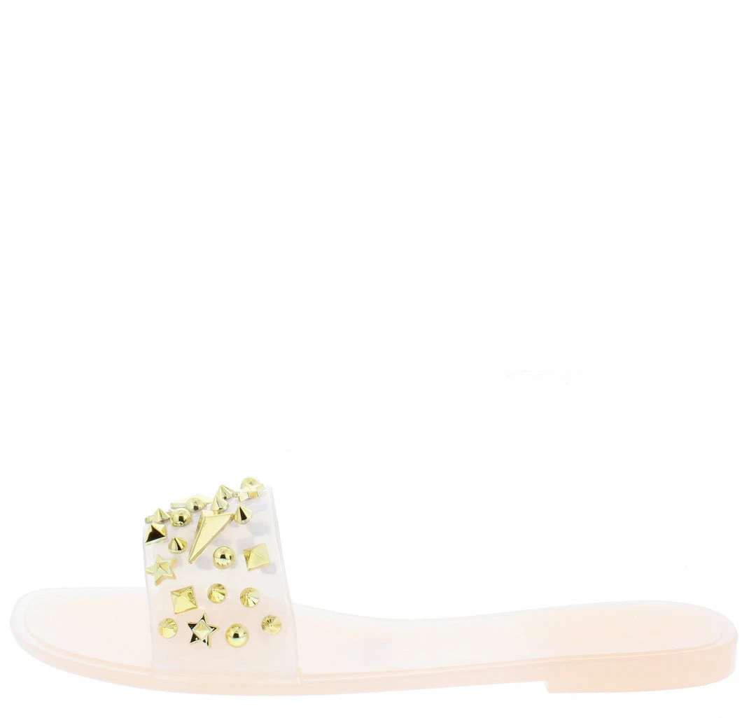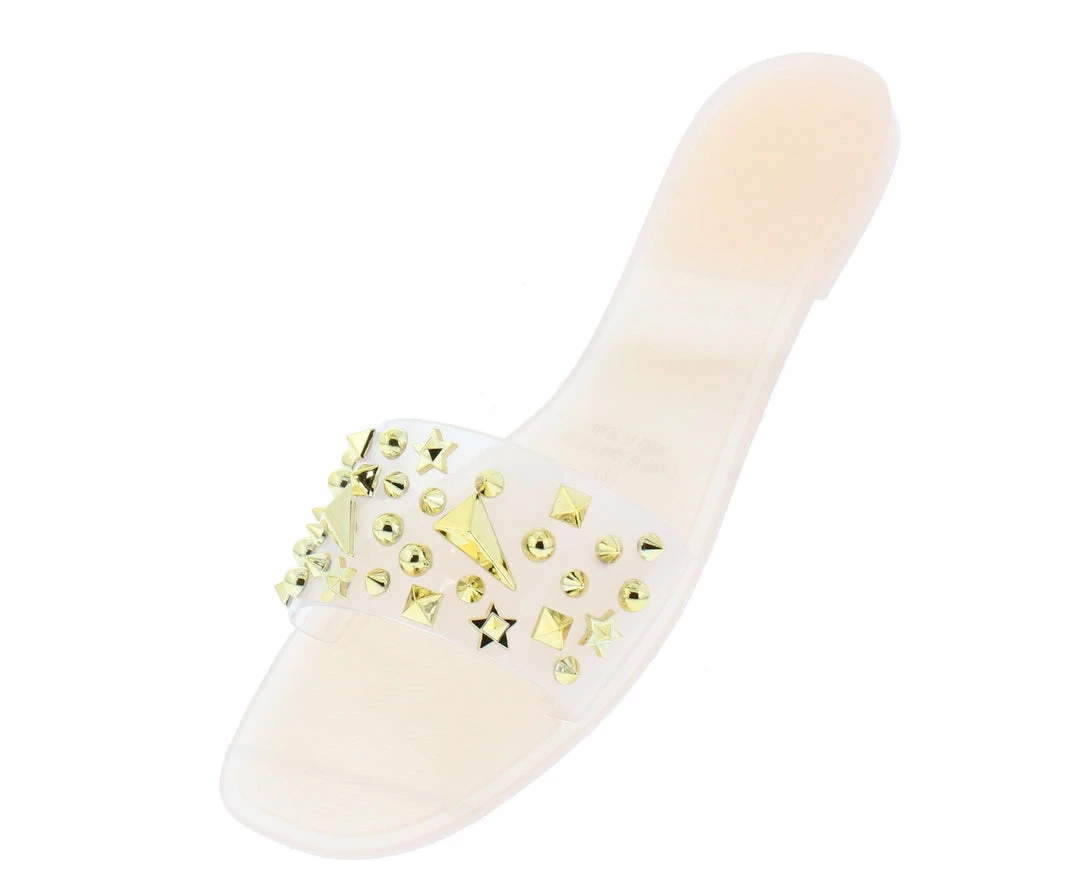- A studded lucite upper with slide on construction.