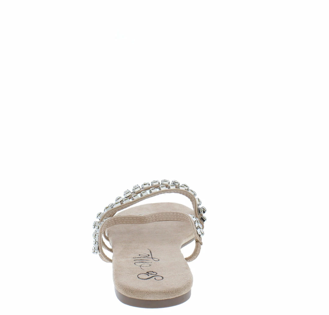 - A flat, single style sole and slide on construction.