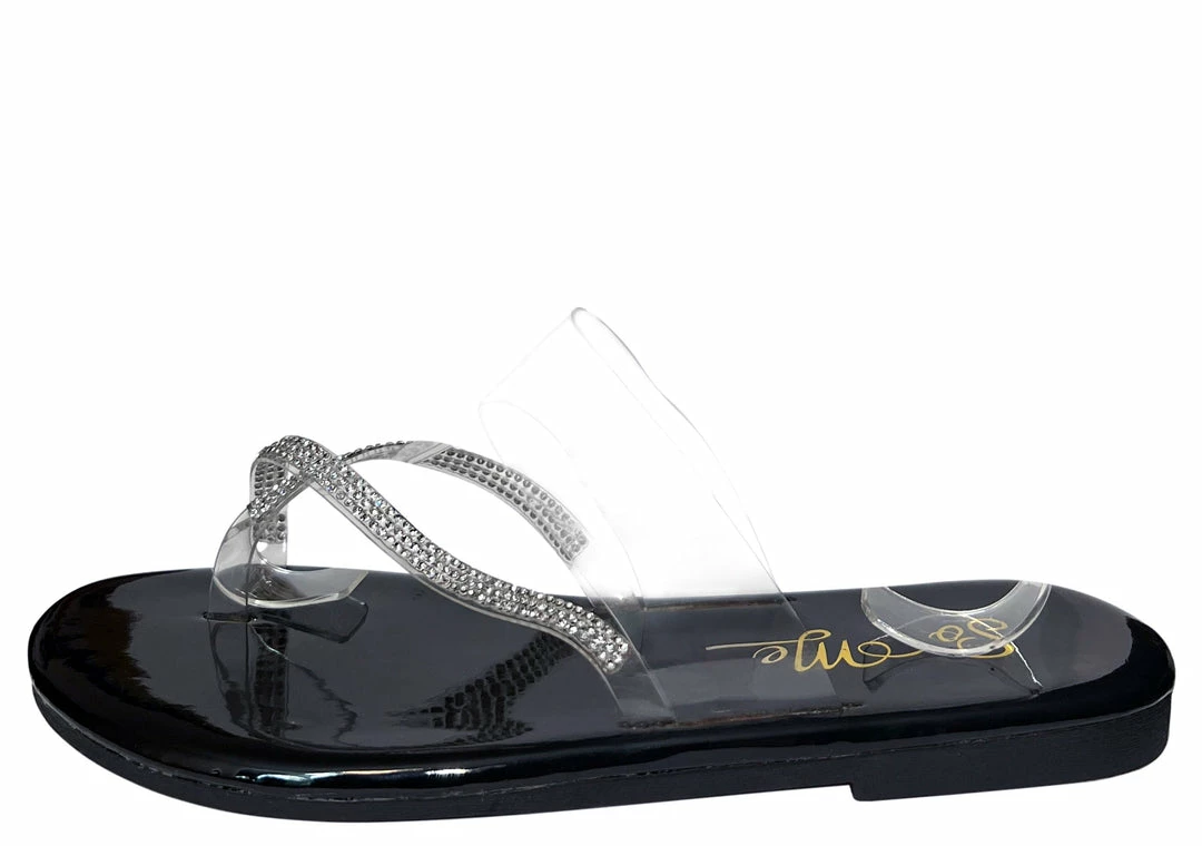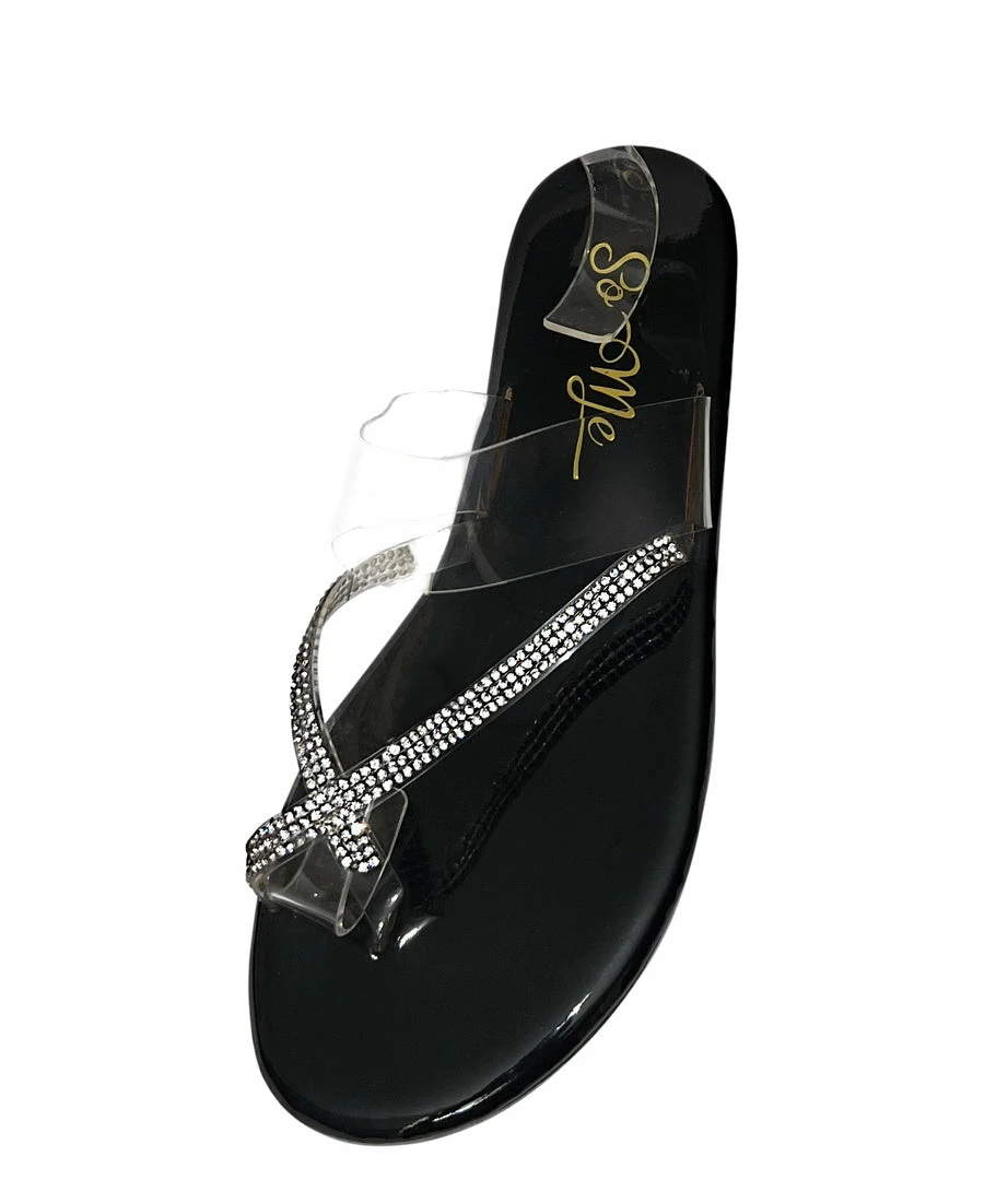 - An embellished cross strap upper and a clear lucite band.