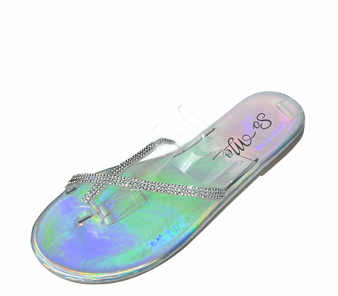 - An embellished cross strap upper and a clear lucite band.