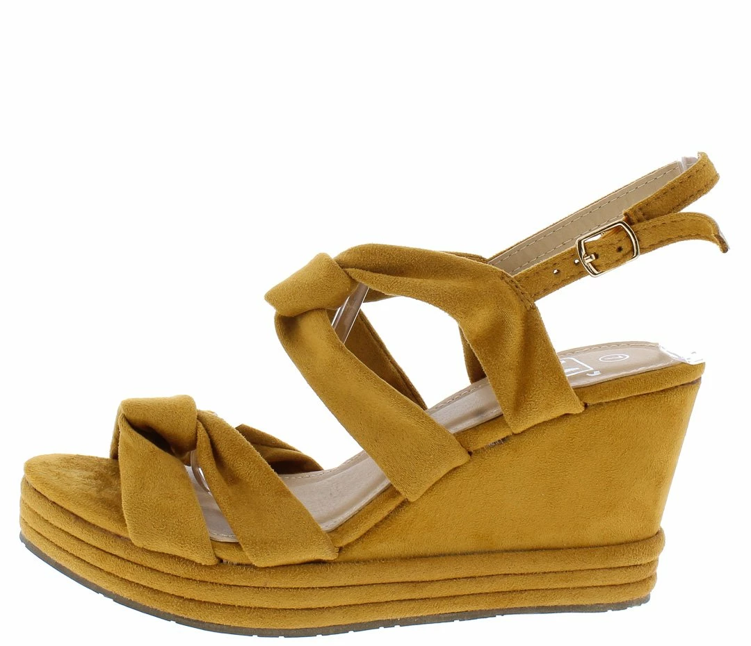 - A textured, low platform sole and wedge heel.
