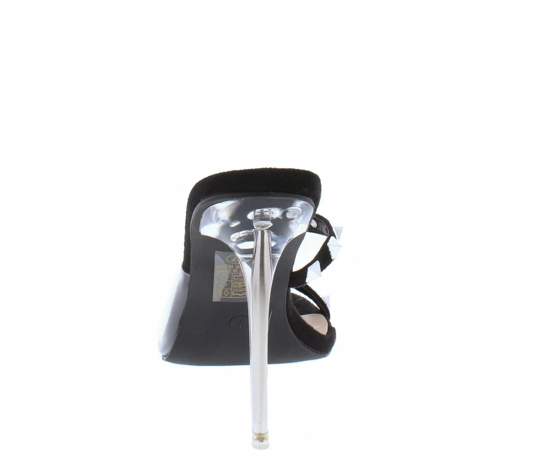 - Single sole styling and a clear lucite stiletto heel.