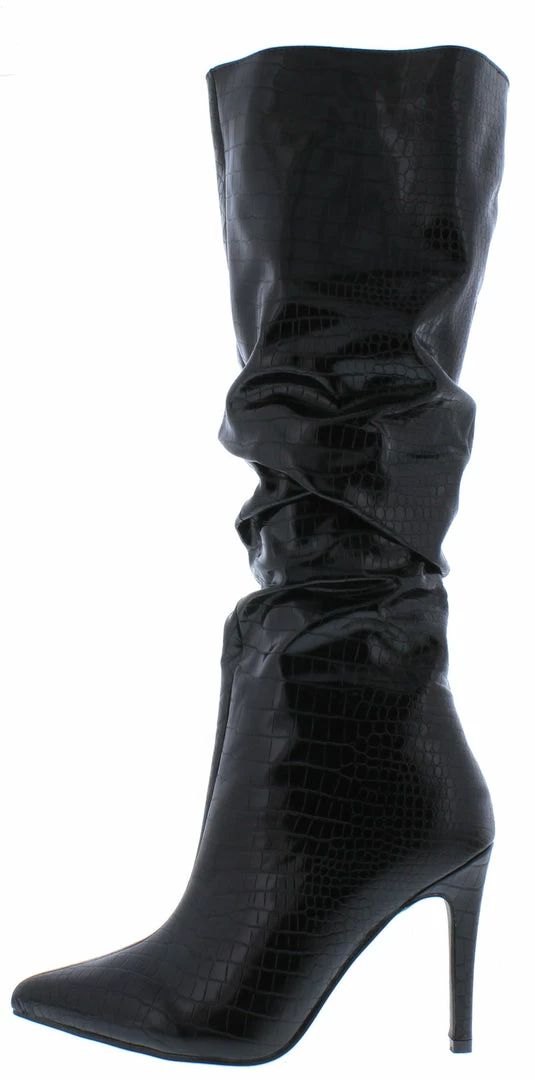 - A faux crocodile upper and knee high shaft.