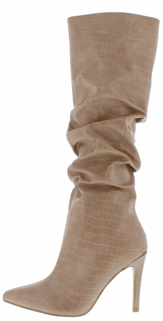 - A faux crocodile upper and knee high shaft.