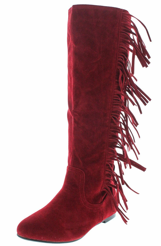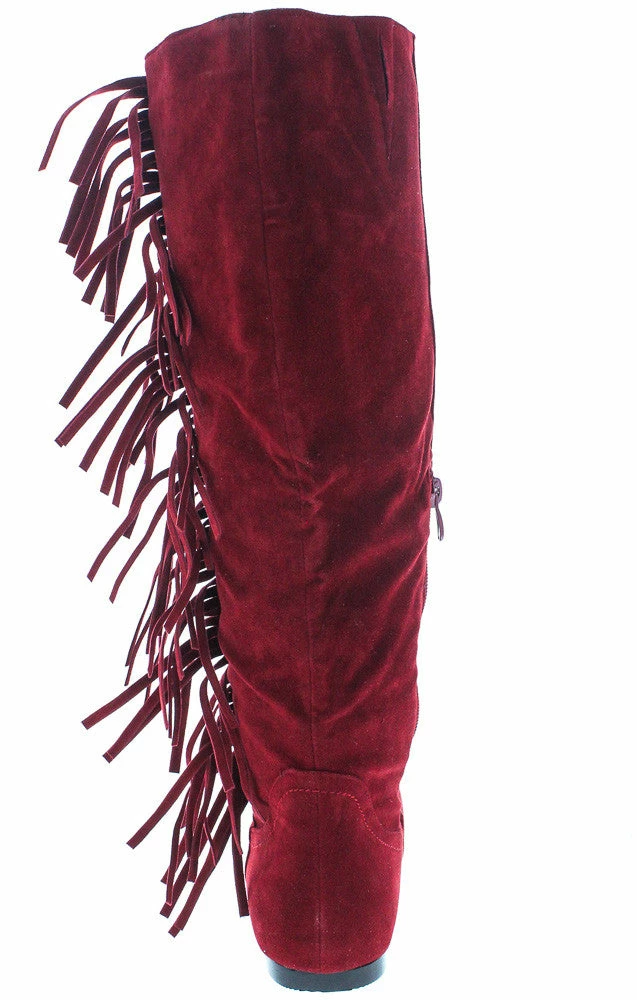 Totally gorgeous boho chic faux suede red side fringe boot. This flat knee high boot is perfect for a casual relaxed gorgeous date night.