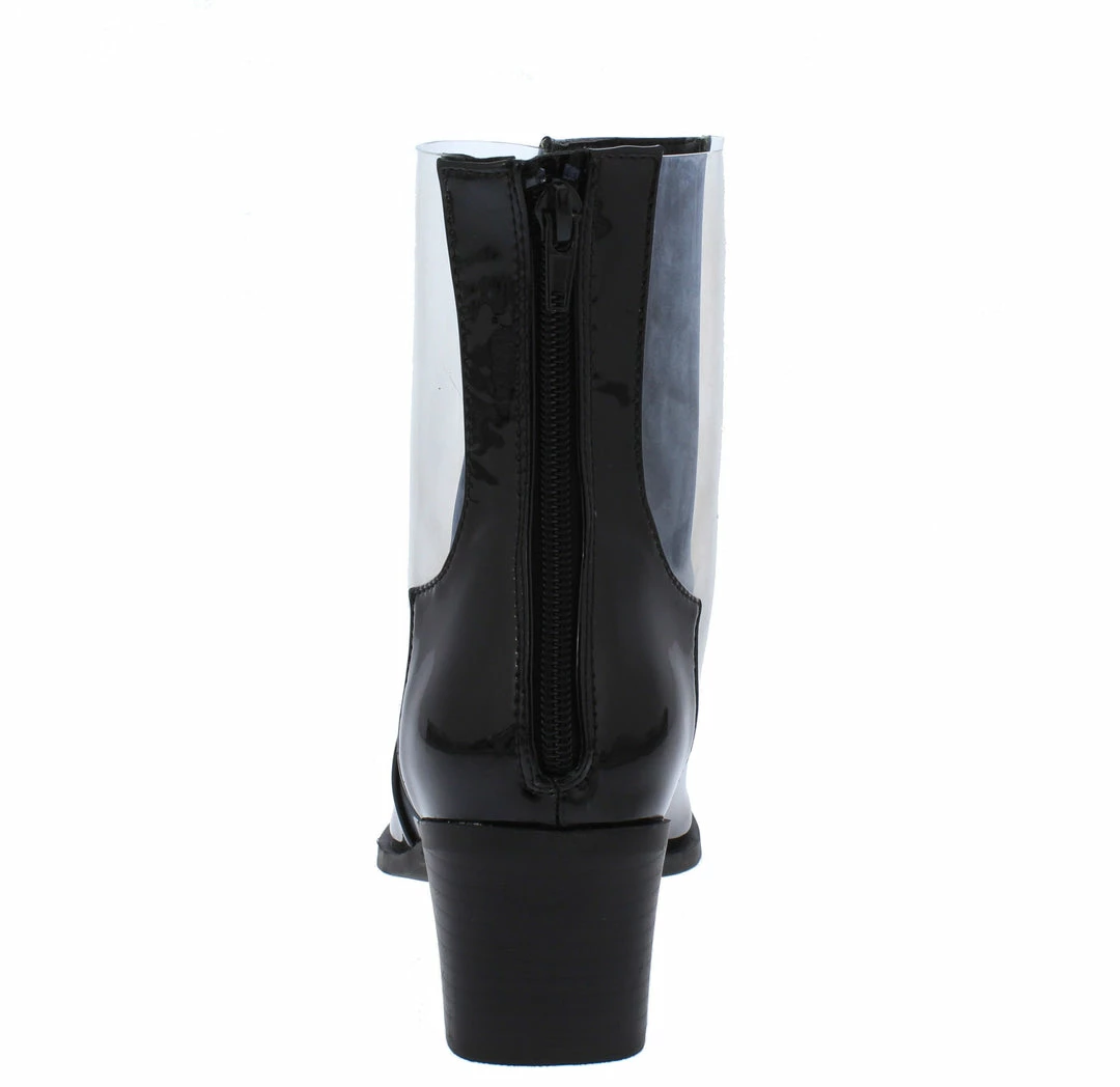 - Clear lucite side panels and a rear zipper closure.