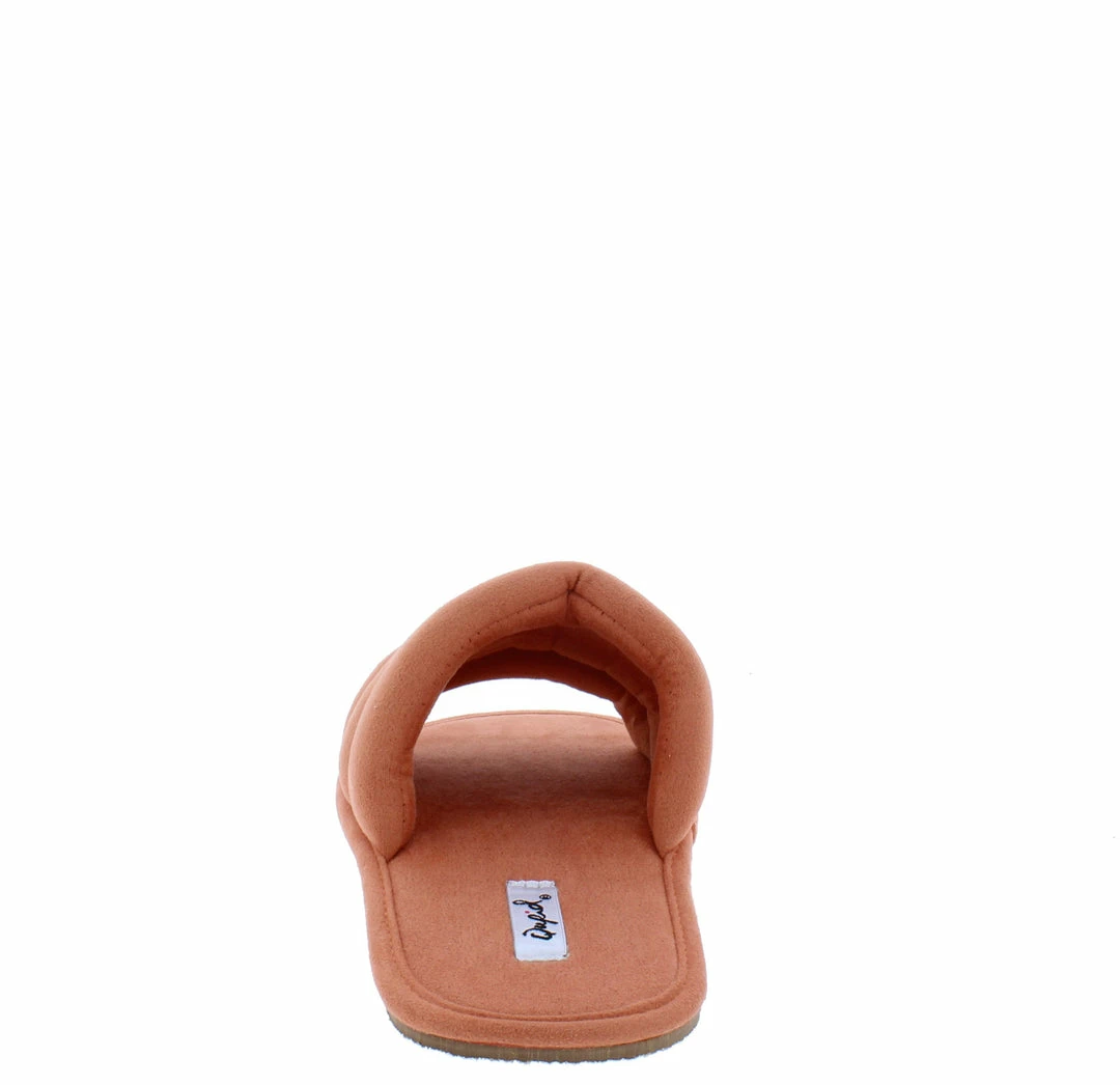 - A quilted upper with slide on construction.