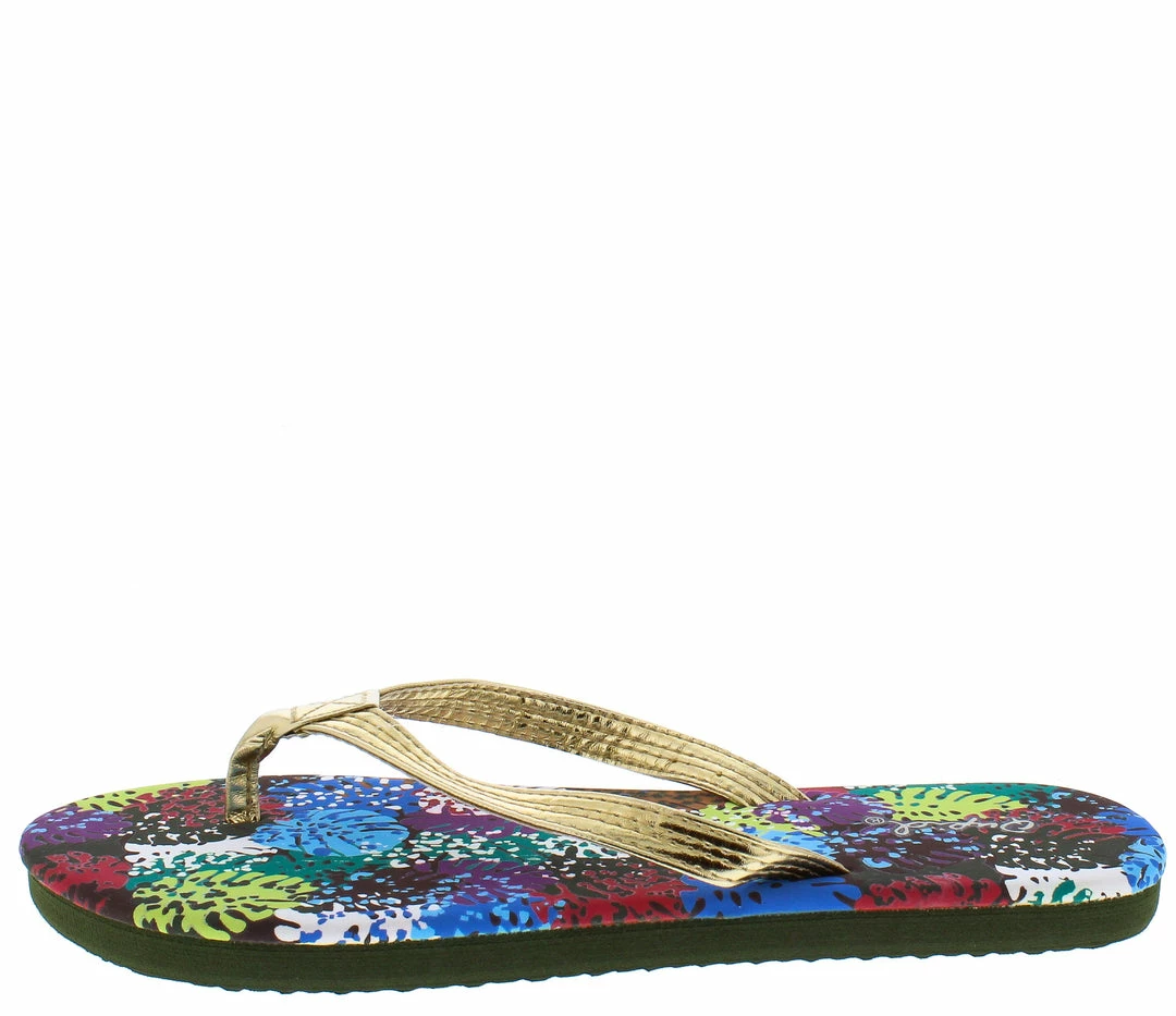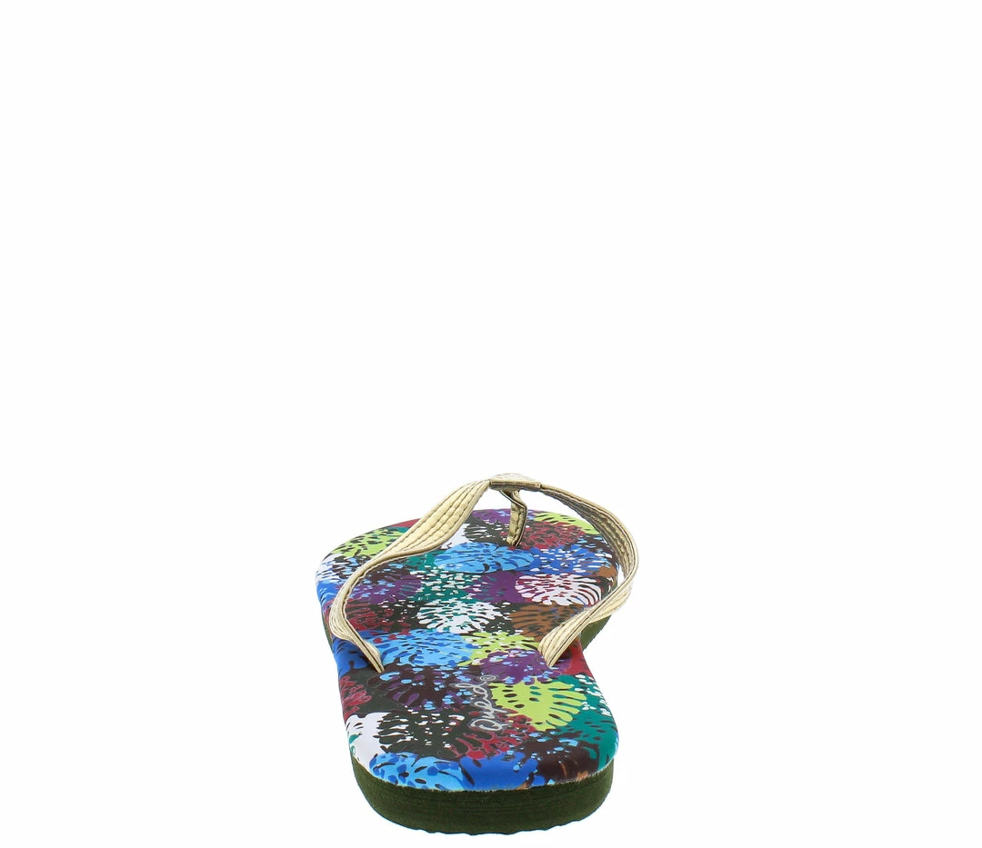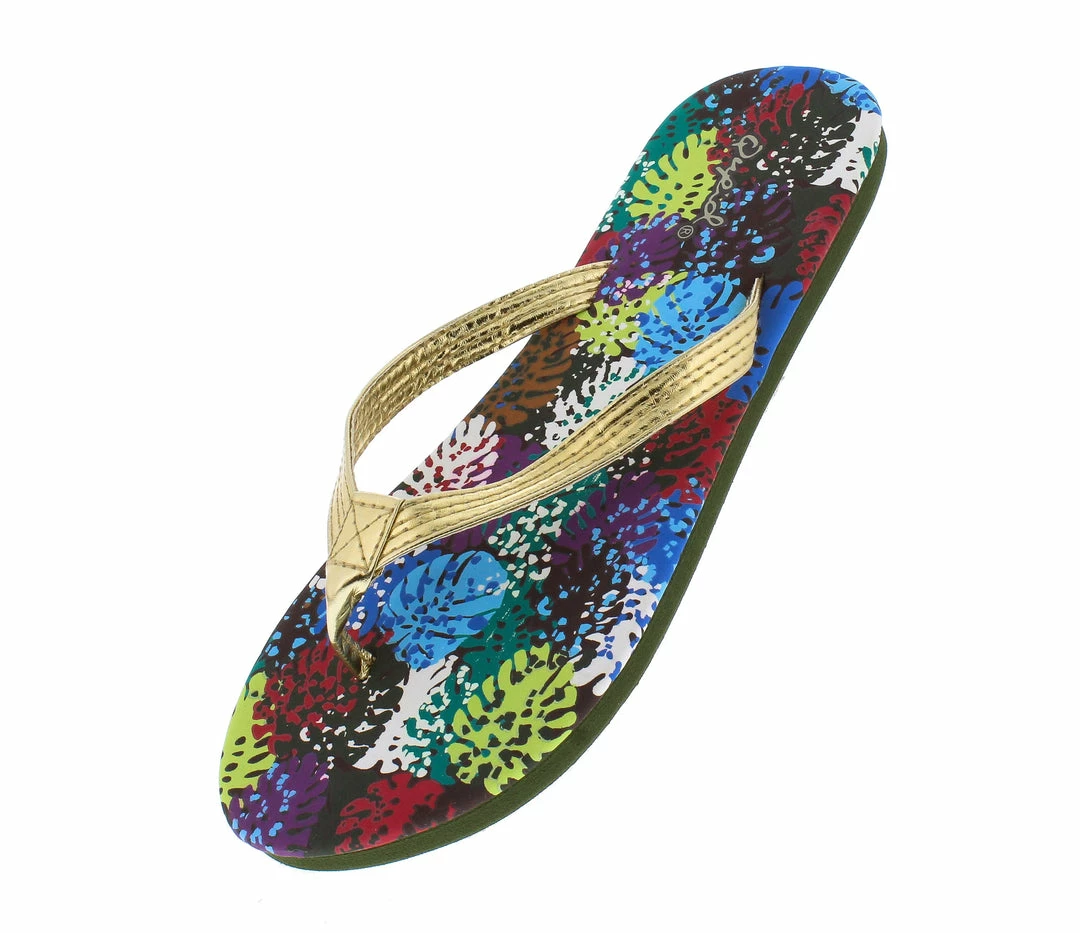 - A multi print upper sole and metallic thong upper.