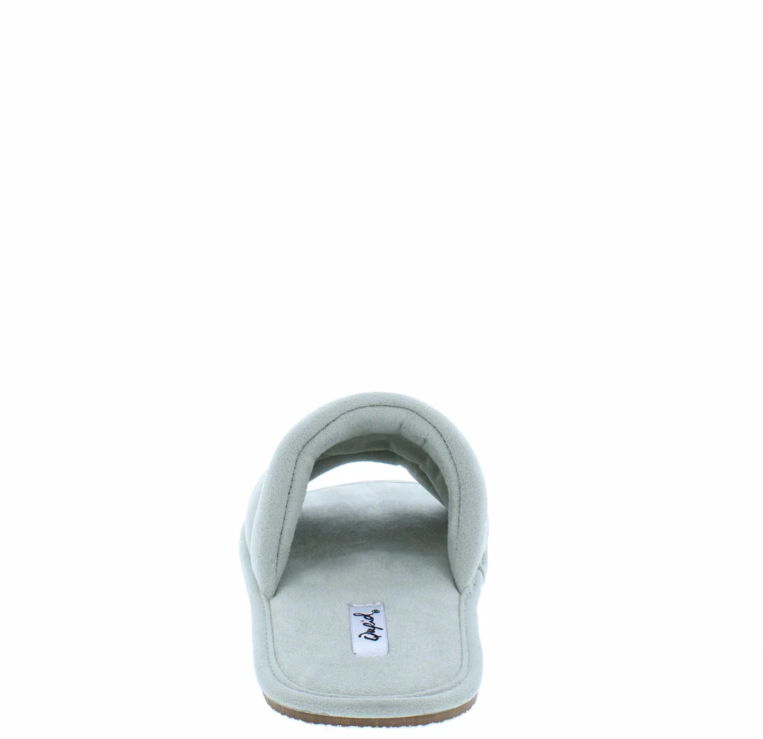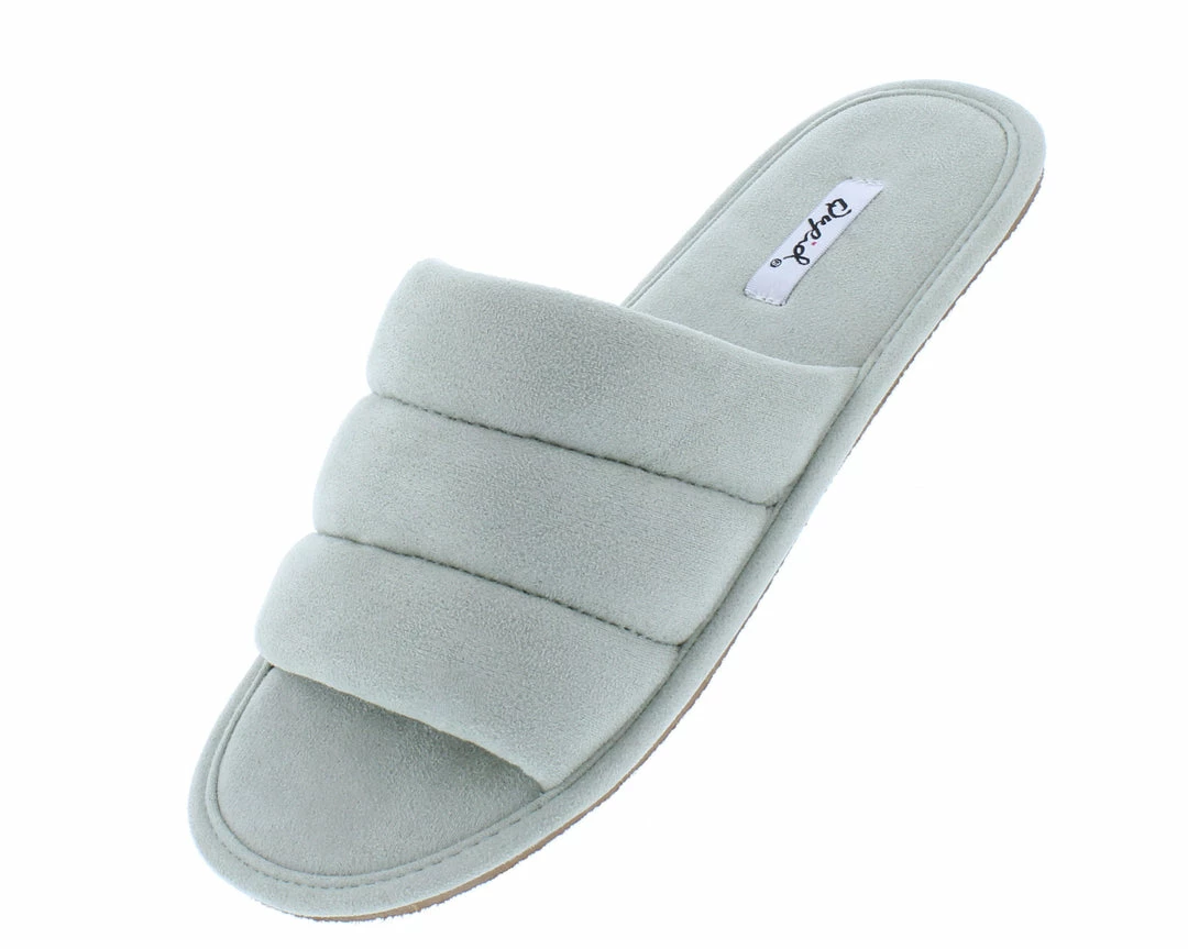 - A quilted upper with slide on construction.