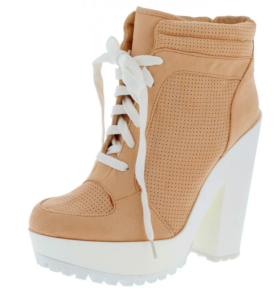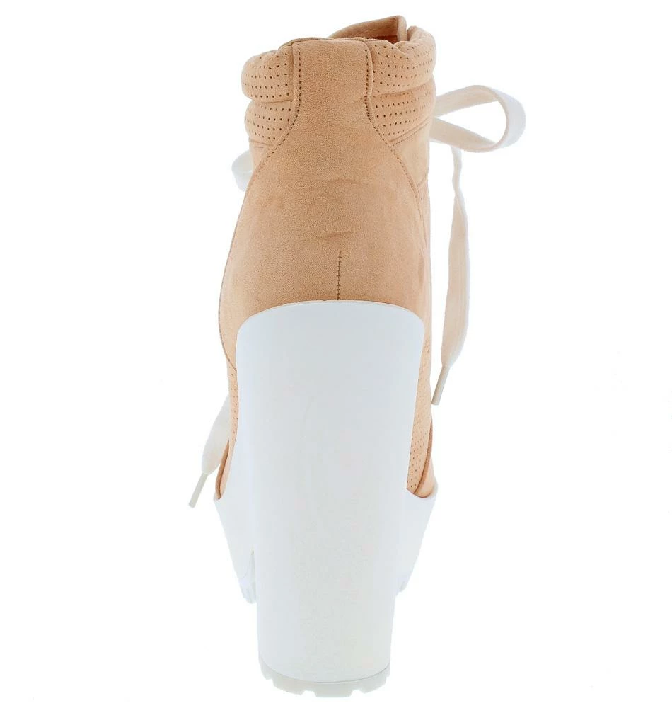 - A white lug sole and tall chunky heel.