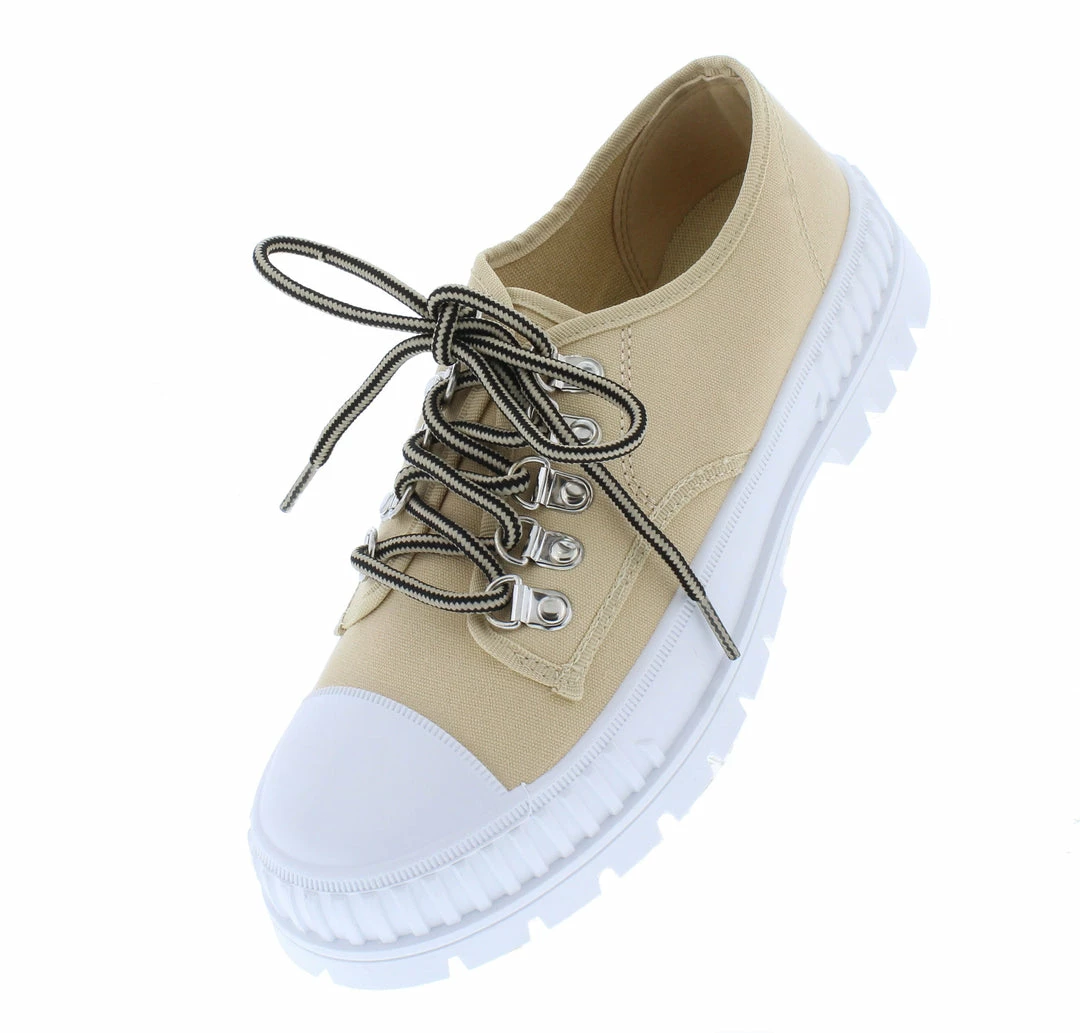 - A white, flat lug sole.