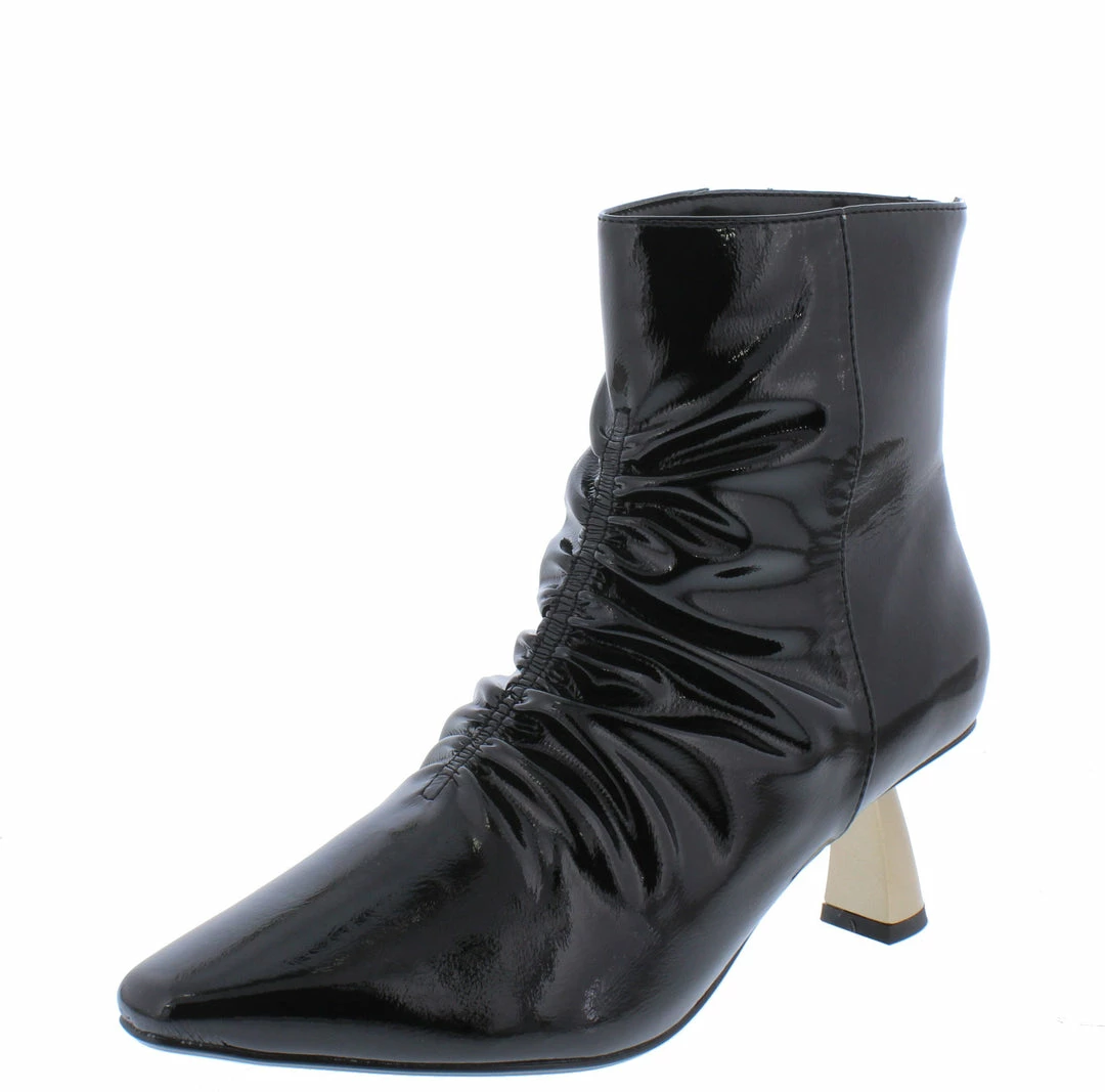 - Single sole styling and an angled, square short heel.