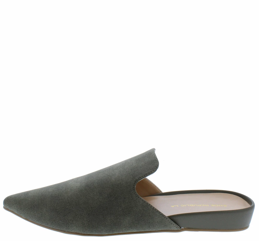 - A flat, single style sole and slide on construction.
