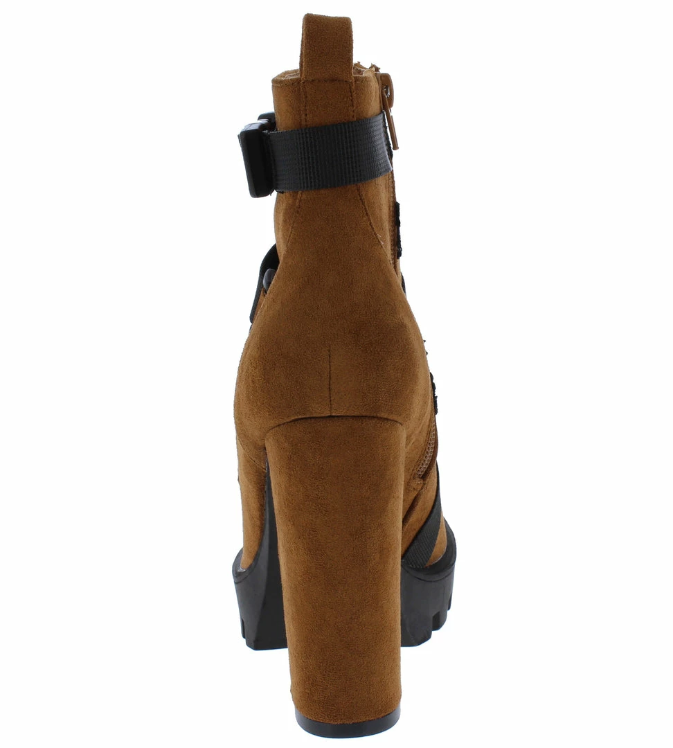 - A lug sole and tall block heel.