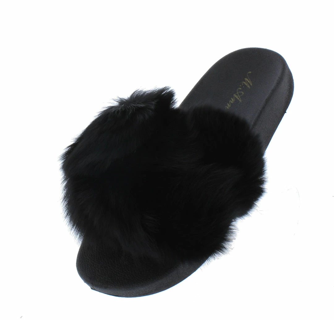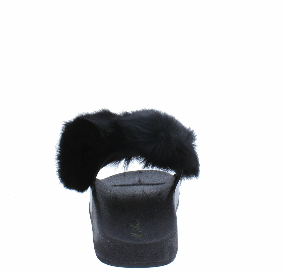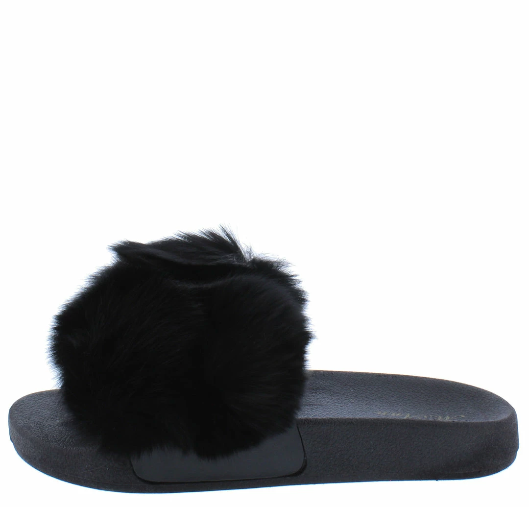 - A pom pom faux fur upper with slide on construction.