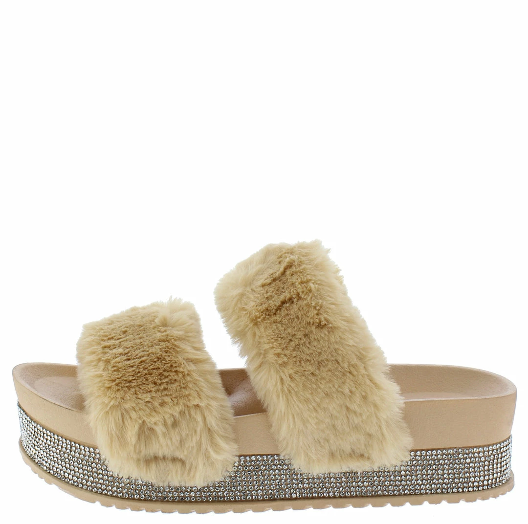 - A faux fur dual strap upper.