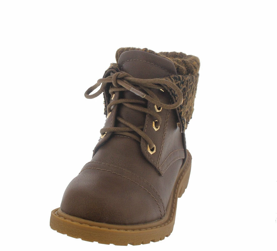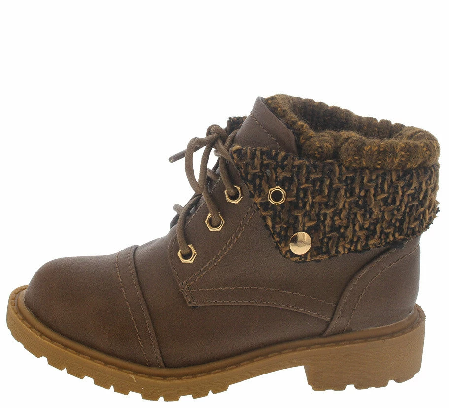- Features a ribbed sweater detail along ankle interior and knit buttoned flap.