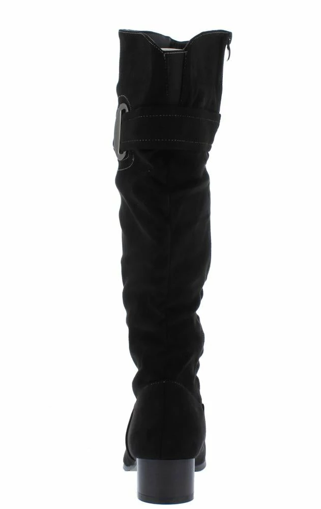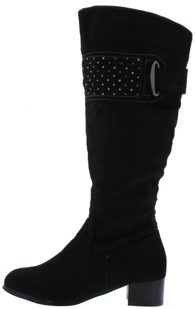 - A knee high shaft with a studded strap panel and an inner side zipper closure.