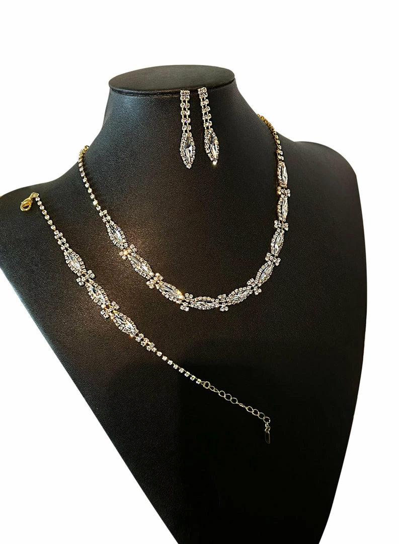 Gold Marquise Cut Multi Stone Necklace, Earrings and Bracelet 3 Piece Set