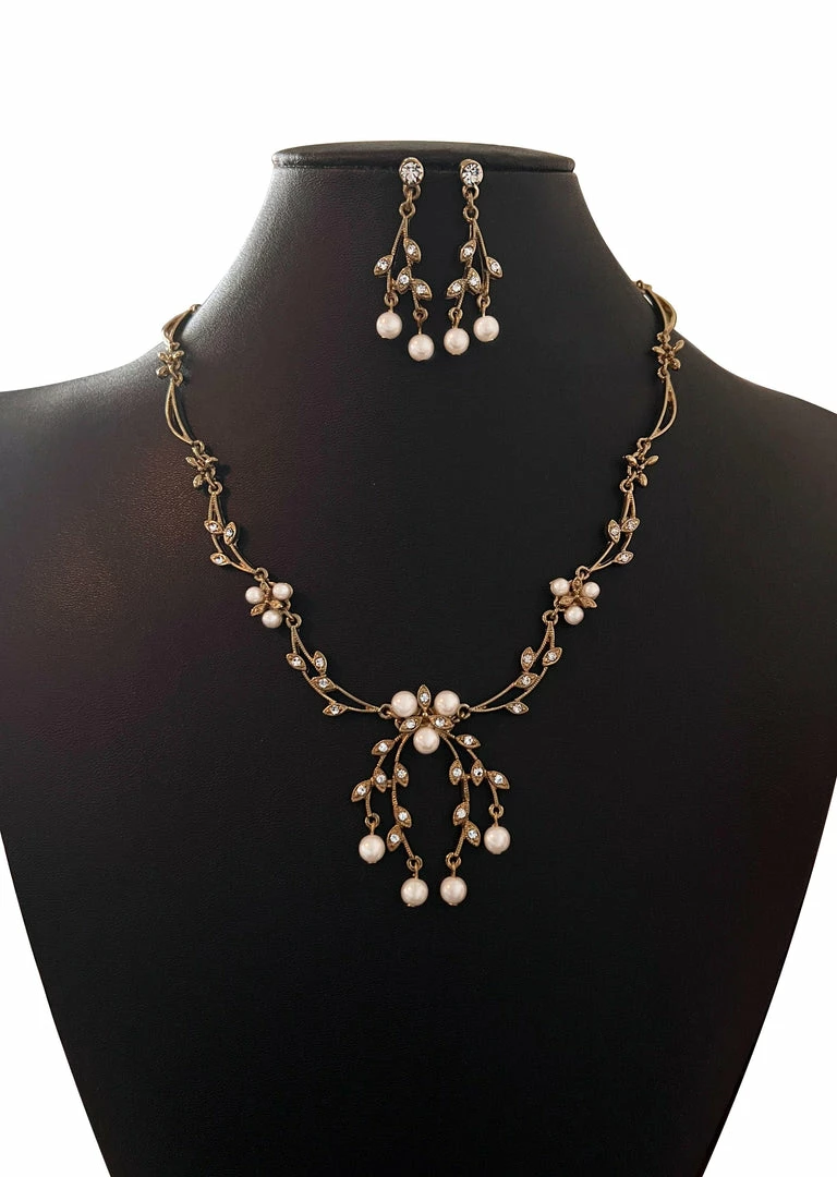 WONA TRADING Pearl Multi Gold Leaf Crystal Necklace And Earring Set